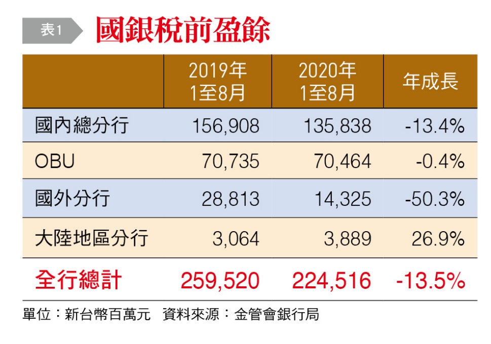 分析國銀的四大獲利引擎,有國內總分行、OBU(國際金融業務分行)、海外分行及中國地區分行;在這四大獲利來源當中,可以看到今年海外分行衰退幅度最大,據金管會在10月上旬公布本國銀行最新營運概況,到8月底止,放款總餘額31兆976億元,較上月底增加1,964億元;逾放比率為0.24%,較上月底減少0.01個百分點,較去年同期增加0.01個百分點。在獲利表現方面,今年前8月稅前盈餘2,245億元,比去年同期衰退13.5%,除大陸地區分行獲利有成長外,其餘包括國內總分行、國際金融業務分行及海外分行的獲利都衰退。〔如表1〕