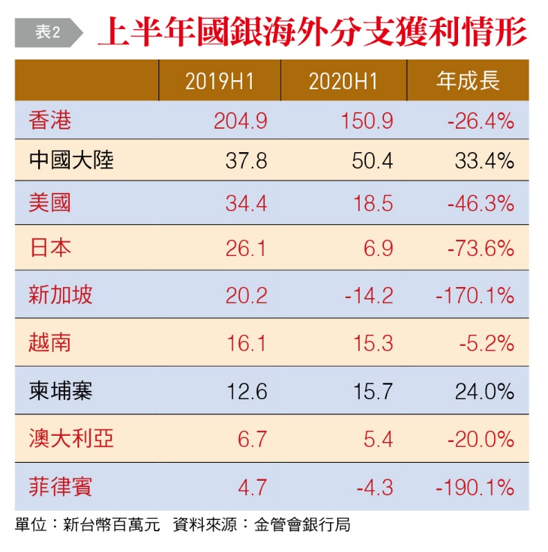 海外分行逾放比率不斷升高,分析其中易踩雷的海外高逾放比區,包含新加坡、香港及美國;國銀在新加坡踩雷,不僅逾放比率高、虧損也高,其中2020年上半年虧損達14.2億元,顯示當地授信資產品質堪憂。其次是日本及美國,今年上半年獲利也比去年同期大幅衰退73.6%及46.3%。香港受到疫情與政治不明確因素影響,今年上半年獲利比去年同期衰退26%。〔如表2〕