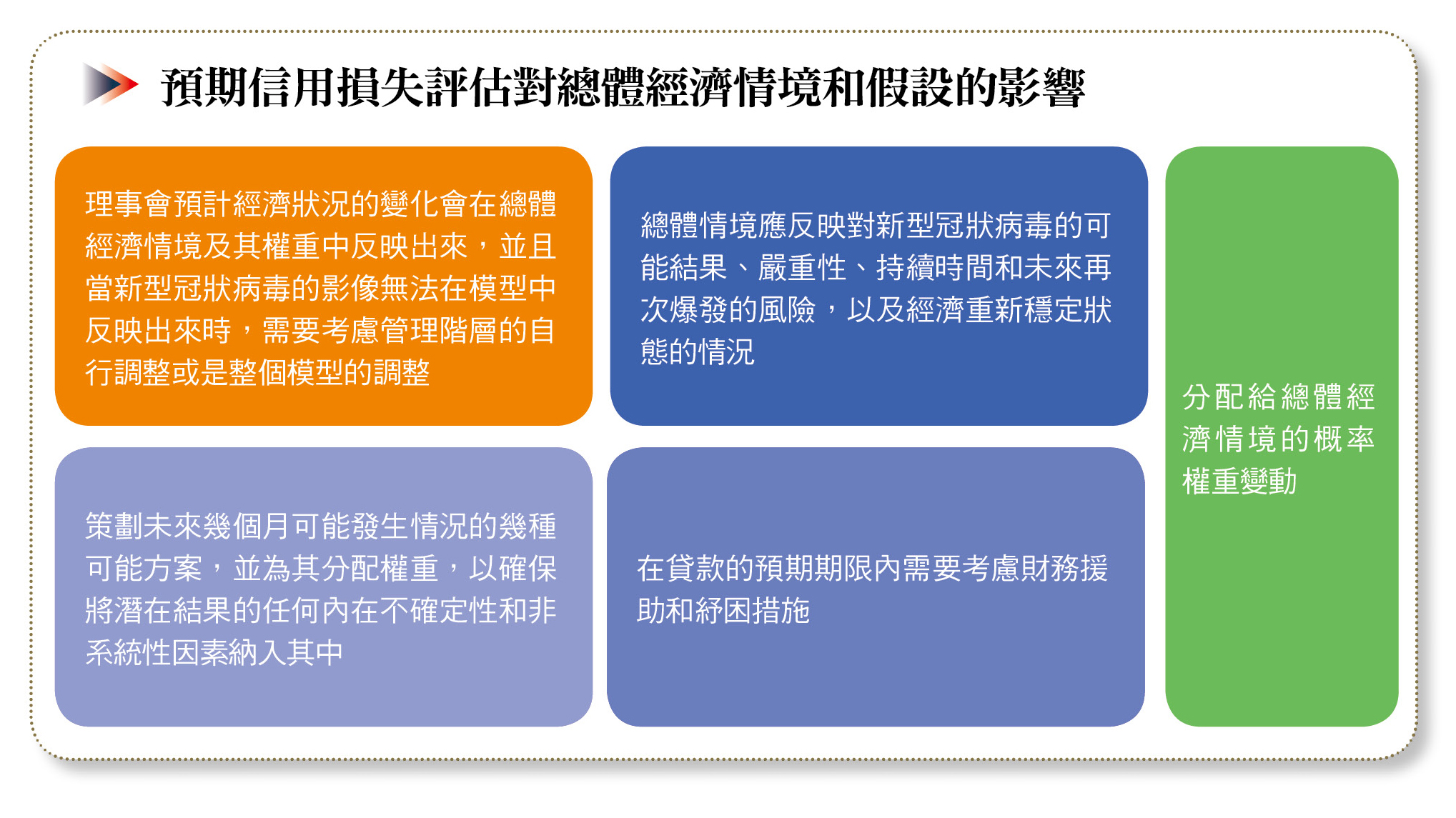 疫情爆發的影響反映在交易對手層面的預期信用損失評估(例如,基於單一借款者的違約概率估計),是要在集體的基礎上納入未來總體經濟狀況的情境分析因素,或是透過管理階層調整的因素,這主要取決於銀行的制度和流程。在實務上,我們觀察到許多國際銀行考慮了這些方法。無論採用哪種方法,在估計新型冠狀病毒爆發的影響時,各家銀行都應避免重複計算交易對手層面評估、放款組合層面評估、總體經濟情境和管理層調整中應用各種假設的影響。