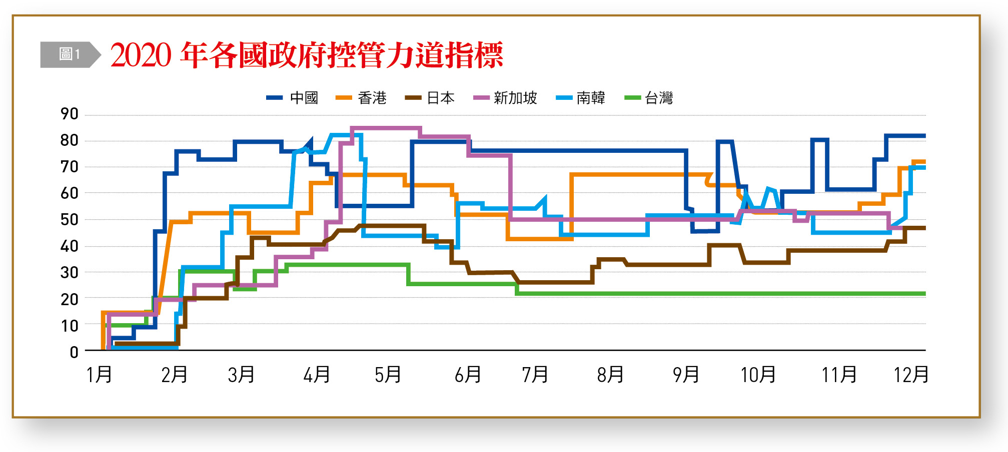 牛津研究團隊找了一百多人組成「政府控管武漢肺炎力道的牛津指標」(Oxford COVID-19 Government Response Tracker)資料庫團隊,發現台灣在2020年3月之後,政府限制日常生活的程度就一直低於其他亞洲國家與地區。日本從4至5月開始嚴加管制,南韓最近也縮得越來越緊〔圖1〕。