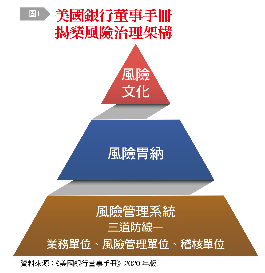 雷仲達分享,隨著時代的嬗遞與金融局勢的變化多端,風險治理成為當前公司治理的重要一環,此次新版《美國銀行董事手冊》特別新增相關章節。直指風險治理架構從上而下,包含風險文化、風險胃納與風險管理系統三個層級以及三道防線〔詳如圖1〕。