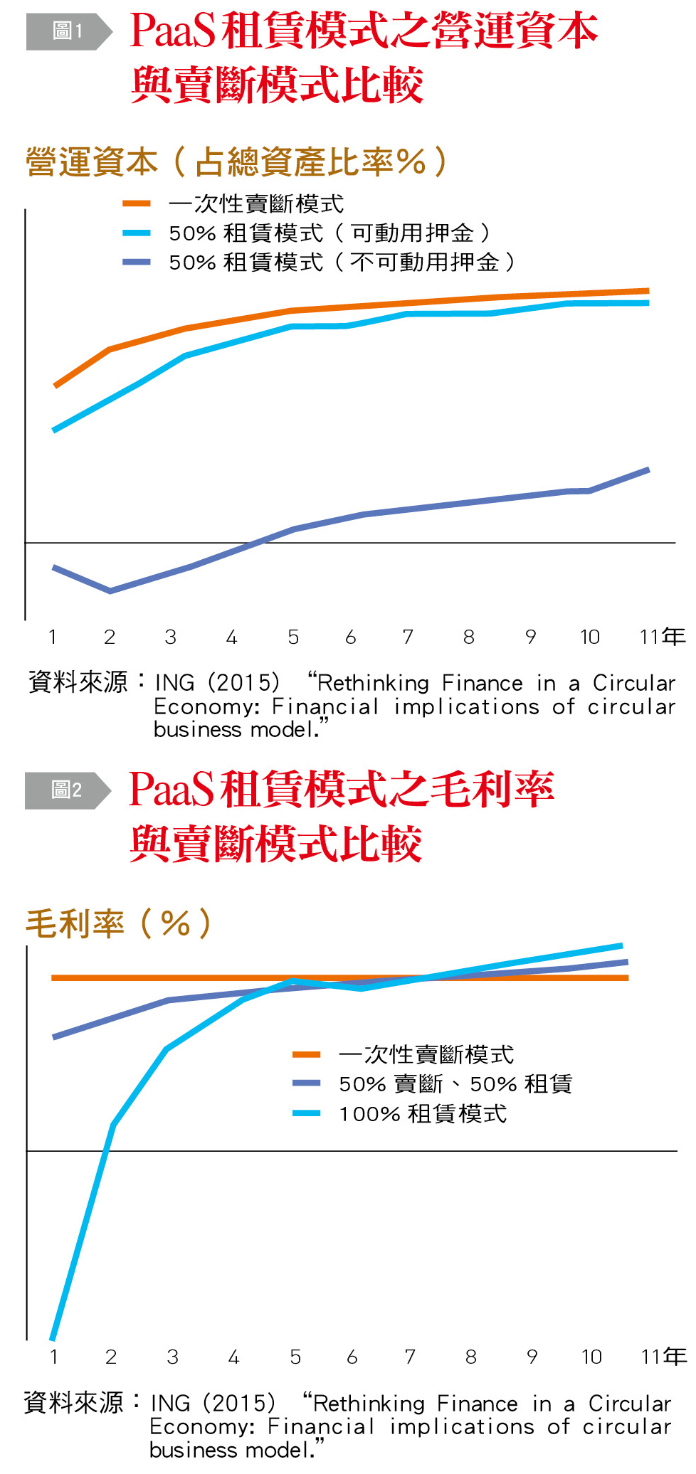 循環經濟籌資難,其實也跟其商業模式特性有關,以PaaS常見的租賃模式為例,鑑於營收來源仰賴客戶分期支付租金,短期內難有充裕現金收入,常陷入營運資本不足之窘境,而必須向外尋求資金奧援。且相較於一次性賣斷模式,在產品銷售當下即可帶來整筆營收,租賃模式受限於分期收租,投資回收需時較長,前期獲利亦難以與之比擬。