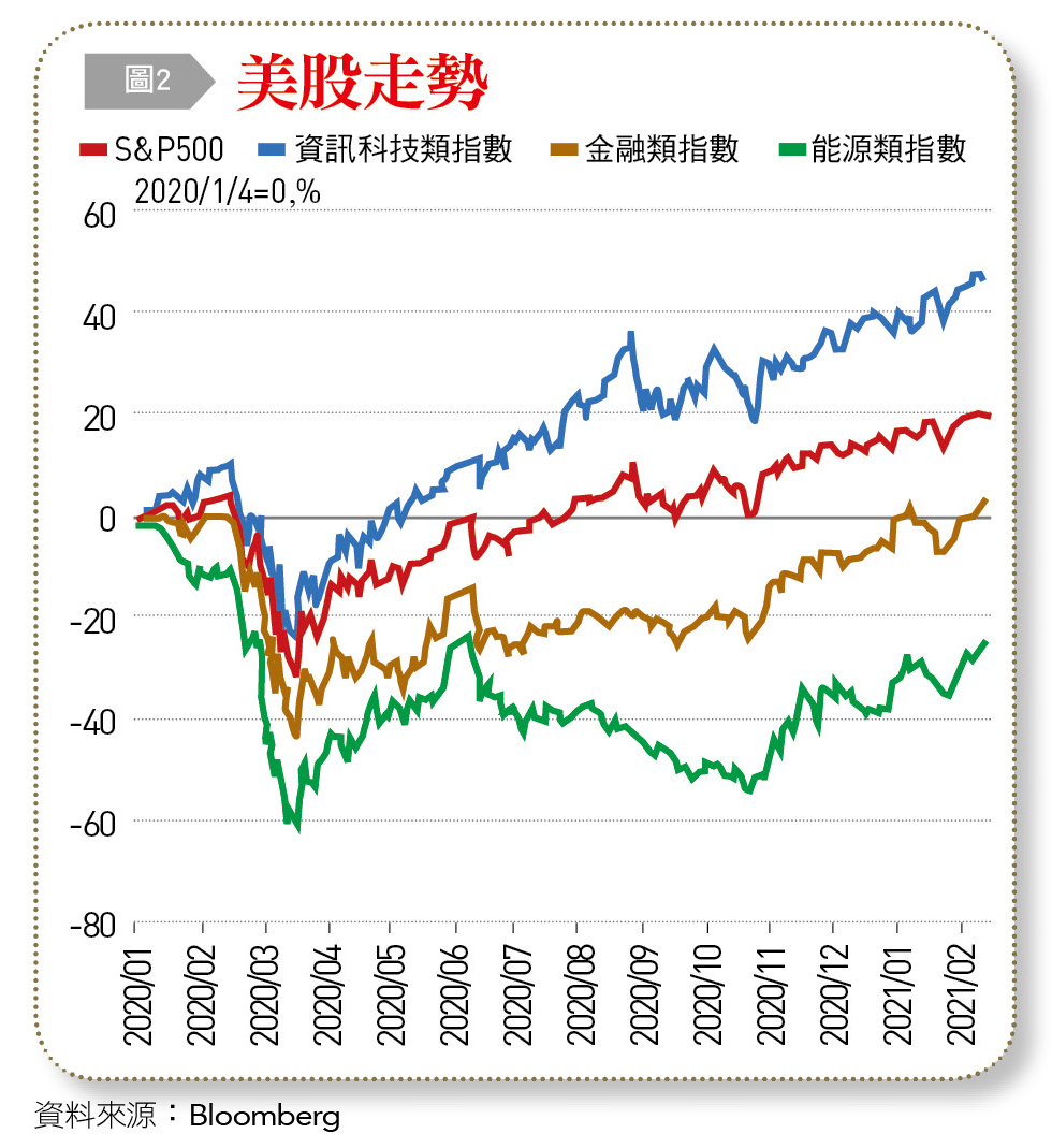 有別於實體經濟,全球股市雖也在疫情爆發後急挫,但自2020年3月下旬便迅速從低點反彈,其後並屢屢創下歷史新高。2021年2月17日標普500(S&P 500)指數漲至3,931.33點,相較谷底漲幅高達75.7%,並較疫情爆發前之高點高出20.67%〔圖2〕,MSCI全球指數更自低點上漲約78%來到682.7點,較其疫前高點漲逾15%。深究全球股市走勢與實體經濟表現明顯脫鉤的原因有四: