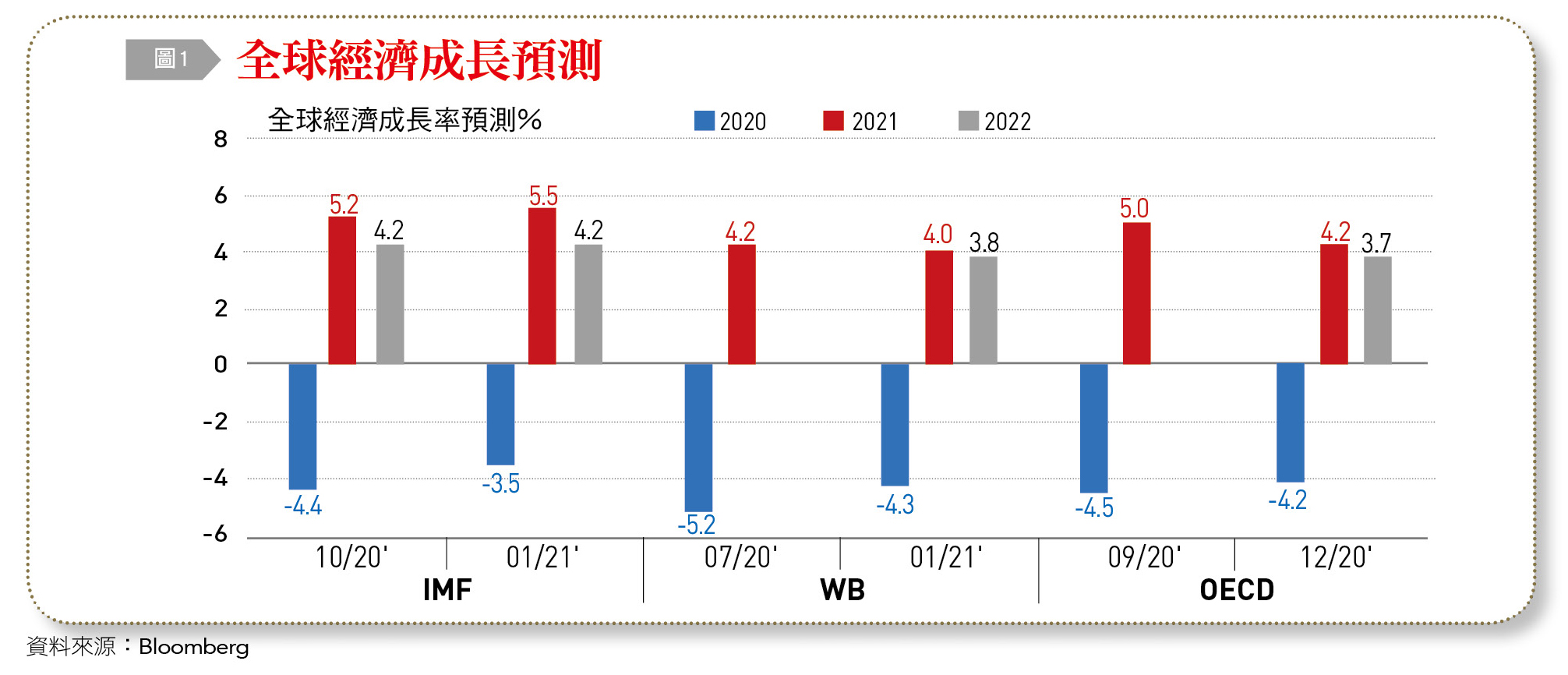 COVID-19肺炎疫情肆虐全球已近一年,至今病例數仍不斷攀升,特別是歐美第二、三波疫情來勢洶洶,英國、南非及巴西等地更發現高傳染性變異病毒株。即使目前許多國家已開始接種疫苗,但全球疫情似乎未見消退。奇怪的是,當前各界對2021年全球經濟展望卻較半年前的看法樂觀,國際貨幣基金(IMF)於今年1月預測2021年全球經濟成長率為5.5%,亦高於前兩次預測的幅度〔圖1〕。