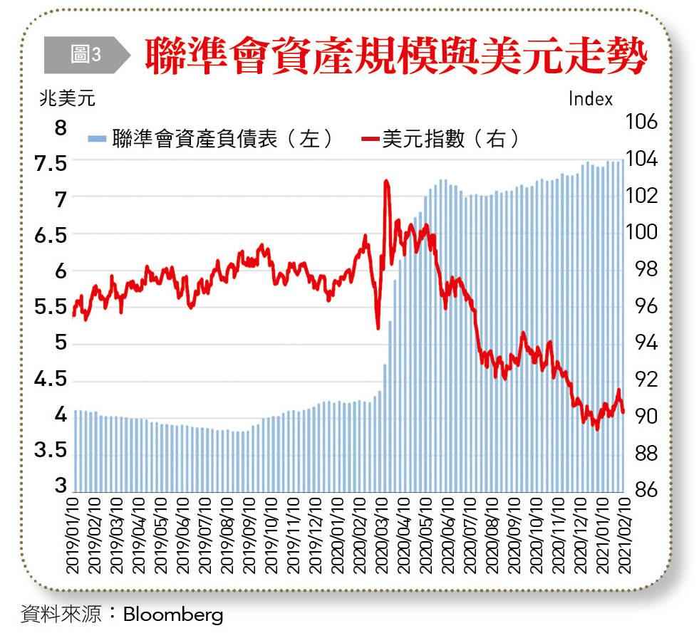 再從與股市緊密連結的外匯市場來看,美元指數自2020年3月20日觸及波段高點102.8後,便開始趨勢性下滑,中間雖偶有反彈,但至2021年2月17日美元指數已來到90.95。事實上,過去每逢重大風險事件導致不確定性上升時,相對安全的美元便成為資金的避風港,促使美元升值。然而,這段期間美元卻呈現趨勢走弱,顯示相較疫情爆發初期,美元隨著投資人在風險追逐(Risk on)與風險趨避(Risk off)之間來回變換而上下起伏。在疫情發展無明顯變化下(即使歐美疫情仍穩定升溫),美元作為避險貨幣的功能性需求降低,加上聯準會創造的極寬鬆貨幣環境,亦造成美元貶值壓力〔圖3〕,近日更因疫苗的問世及亞洲地區的強勁復甦,致資金持續流出美國,故即便美元指數略有反彈,市場仍普遍認為美元將維持弱勢格局。