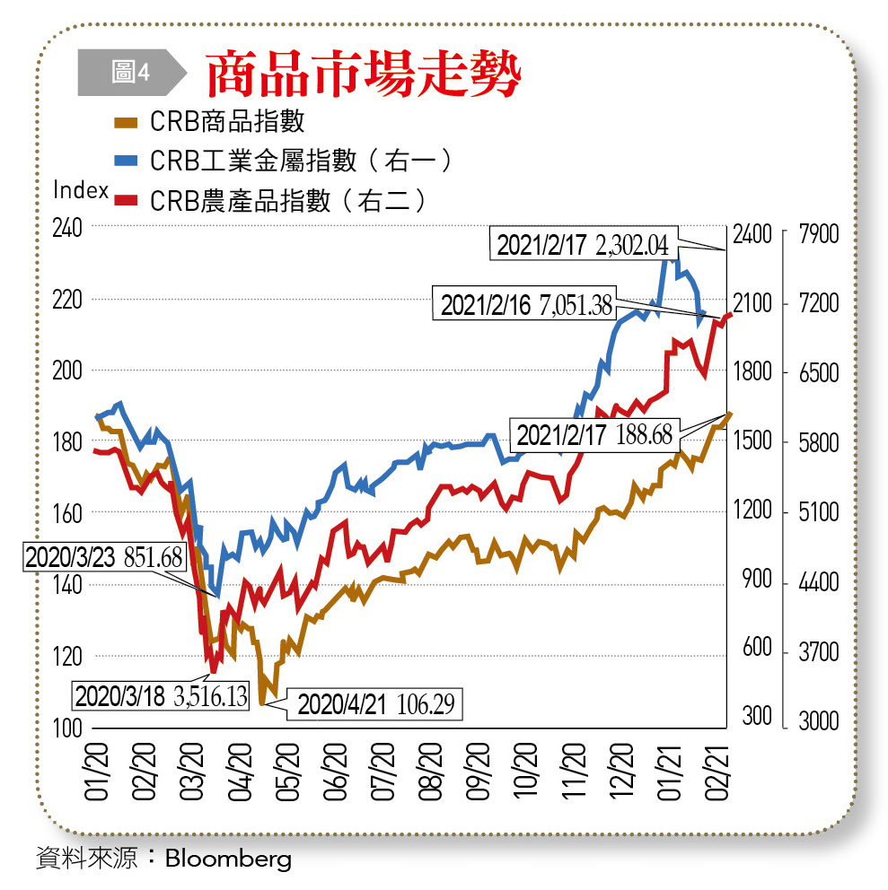 在商品市場方面,由於聯準會與各國央行超寬鬆的貨幣政策,及美元指數大幅走貶,使得以美元計價為主的國際大宗商品價格出現明顯上漲,具有代表性的商品研究局(CRB)期貨價格指數即由2020年4月21日低點的106.3點,一路上漲至2021年2月17日的188.7點,漲幅達到77.5%。個別分類指數漲幅更為驚人,CRB工業金屬指數由2020年3月23日的低點851.68點大漲至2021年2月17日高點的2,302點,漲幅高達170.3%;CRB農產品指數亦由2020年3月18日低點的3,516.13點,漲至2021年2月16日高點的7,051.38點,漲幅為100.5%,兩者皆遠大於同期間美國S&P 500指數漲幅〔圖4〕。