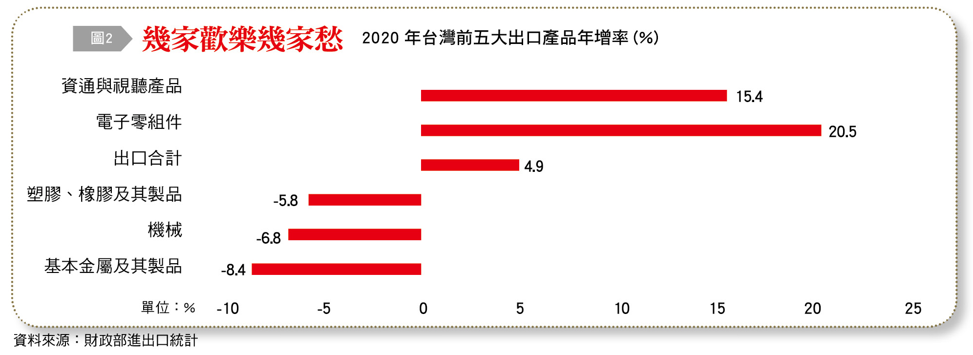 以出口為例,根據財政部統計資料,2020年台灣出口總額(以美元計價)比起前一年度成長4.9%,但在前五大出口產品中,只有占比最高的「電子零組件」及「資通與視聽產品」表現強勁,年成長率分別高達20.5%和15.4%;反觀「基本金屬及其製品」、「機械」、「塑膠、橡膠及其製品」,則分別比前一年度衰退8.4%、6.8%及5.8%。