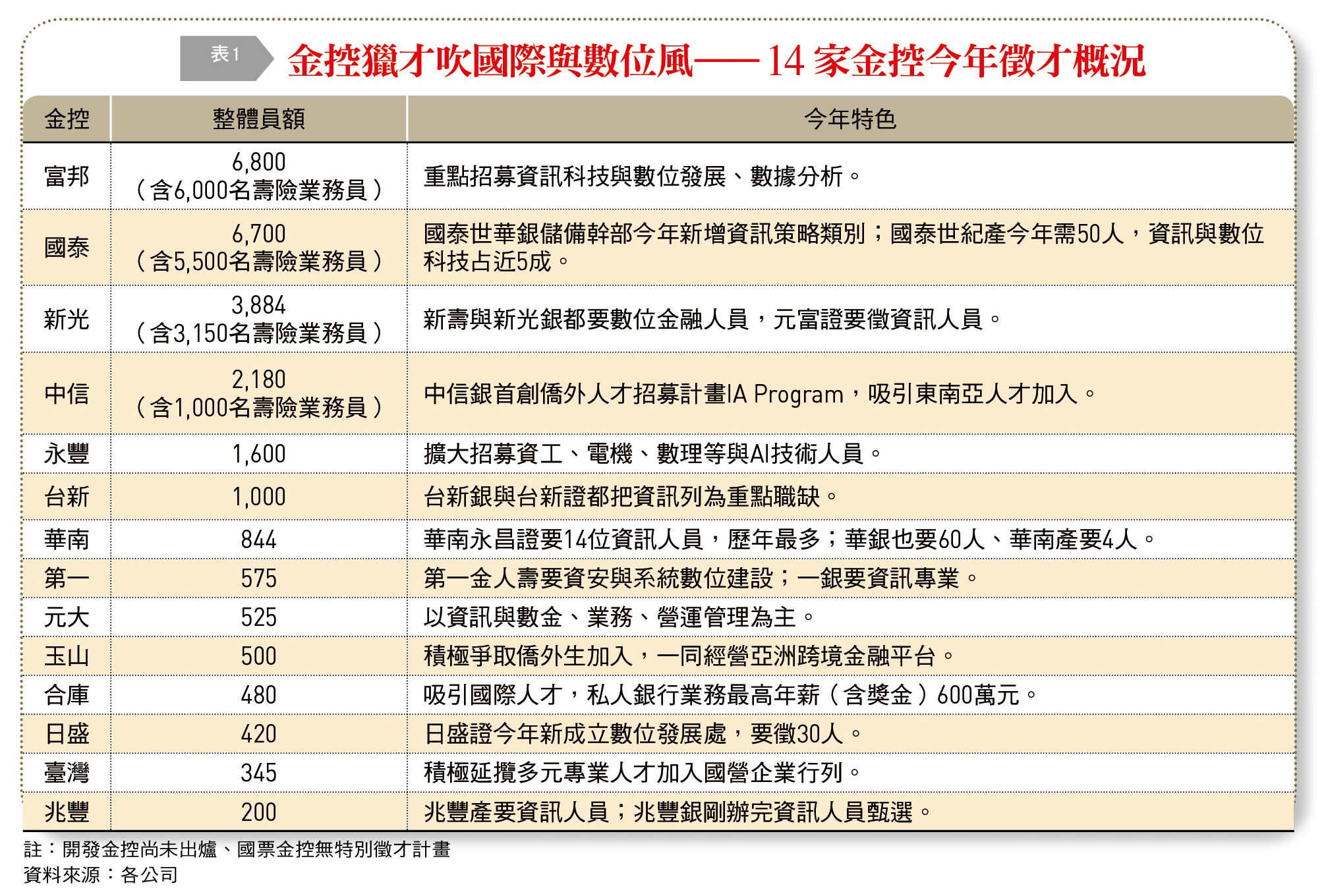 又到金融業3月徵才旺季,國內16家金控除了開發尚未定案、國票無特別徵才計畫,其餘14家均已出爐。數位化、國際化堪稱兩大特色,前者從銀行延燒至產、壽險與證券等子公司;後者則有中信、玉山、合庫等展現強烈企圖。