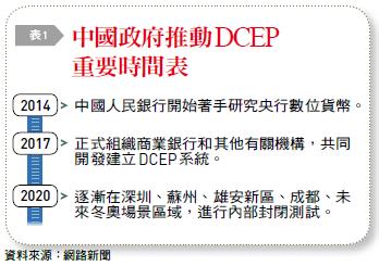 中國政府為了挑戰美元在全球金融體系中的霸權,從2014年起開始發展央行數位貨幣〔發展進度詳見表1〕。當然,它一直在讓人民幣國際化,因此也可以說,這只是用數位方式加速國際化的方案而已。如果中國能打造出一個全球公用的數位支付系統,就不會再被環球銀行金融電信協會(SWIFT)綁住,理論上也可以想跟誰交易就跟誰交易。