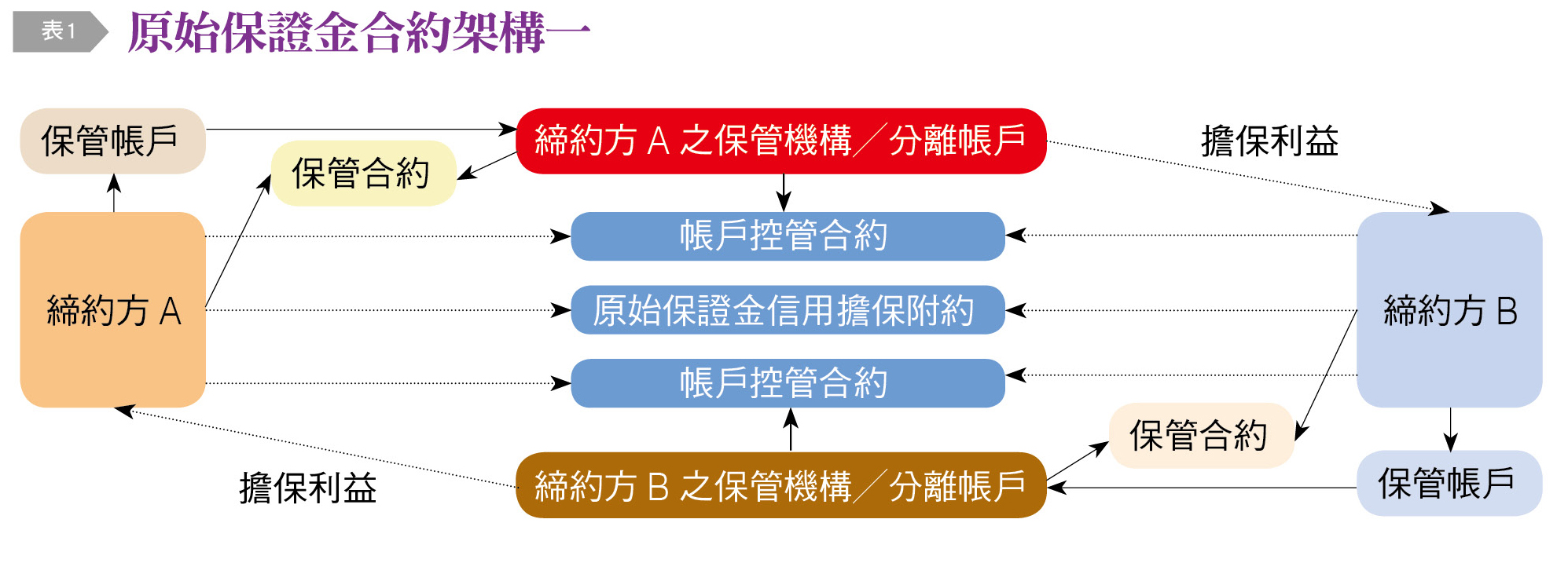 原始保證金合約架構同時涉及交易雙方與雙方各自擇用的保管機構間的權利義務關係,其架構及內容頗為複雜。國際金融實務上,如交易雙方均選擇以銀行作為其原始保證金保管機構,金融機構會與交易對手簽訂ISDA原始保證金信用擔保附約(Credit Support Annex/Deed for IM, IM CSA),以作為雙方間提撥及持續維運原始保證金的合約基礎。此外,為確保保管機構分所保管的原始保證金得到破產隔離的保護,並具體化三方間的權利義務,交易雙方除須各自與其選定之保管機構簽訂保管合約(Custody Agreement)外,並須與保管機構及交易對手簽訂三方之帳戶管控合約(Account Control Agreement, ACA)。前述原始保證金合約架構見〔表1〕。