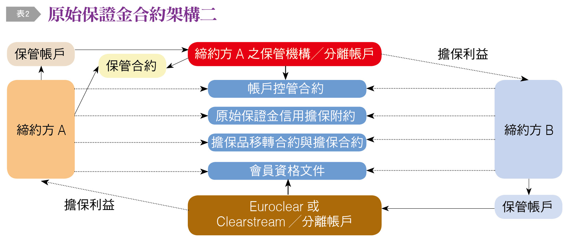 如交易一方選定Euroclear或Clearstream等保管機構作為其原始保證金,交易另一方則選擇以銀行作為原始保證金保管機構時,其合約架構〔表2〕則與〔表1〕情形略有不同。於上述情形,交易雙方需取得各該結算所之會員資格或擇用有各該結算所會員資格的金融機構作為其代理人,並須再簽訂擔保品移轉合約(Collateral Transfer A greement, CTA)及擔保合約(Security Agreement, SA)。