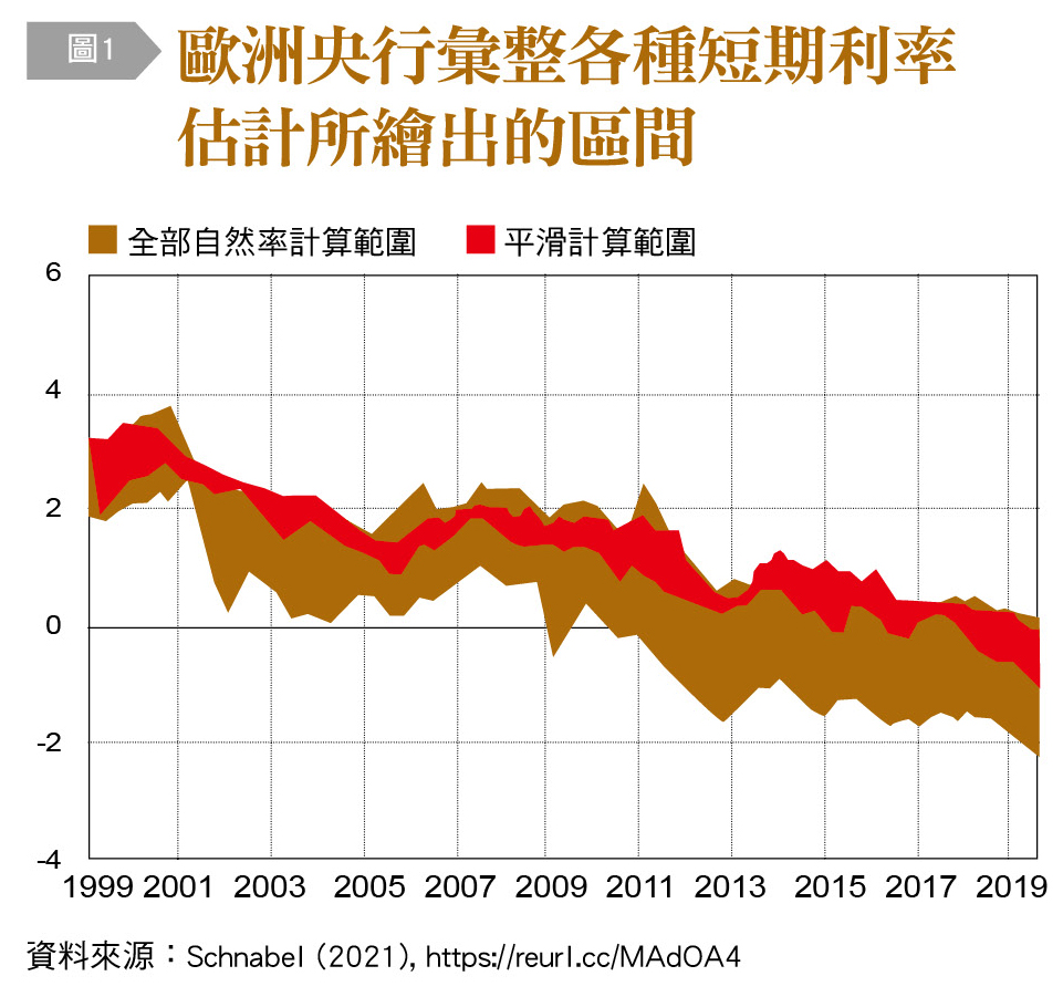 首先,先進經濟體的通膨自2012年以來,沒有一個年份超過2%,失業與通膨的關係曲線(Phillips Curve)斜率是平坦的,且沒有任何統計學上的顯著變化。在儲蓄遠高於投資且通膨穩定的考量下,估計出的均衡短期利率可能為負,如〔圖1〕所示。由於貨幣政策是需求面的行動,為了規避低利率的限制,歐洲央行啟動了非常態的緊急資產購買計畫(PEPP)與一系列長期再融資操作(TLTROIII)且成效顯著,不過資產購買的空間也越來越小。尤有甚者,進一步寬鬆的成本可能會超過利益,尤其是在金融穩定方面所可能付出的代價。