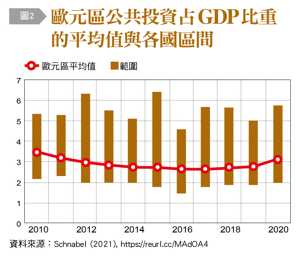 其次,公共財政支出對於利率並不敏感,但近年公共投資如〔圖2〕所示,卻是呈現不增反減的遲滯趨勢,這或許仍與揮之不去的債務危機陰霾有關。許多人仍會受到公部門支出排擠私人投資這種傳統看法的影響,於是這個在低利率下提振需求最有效的方法並未獲得重視。但事實是在經濟衰退時,若政府投資不振,私人部門也不會願意跟進。