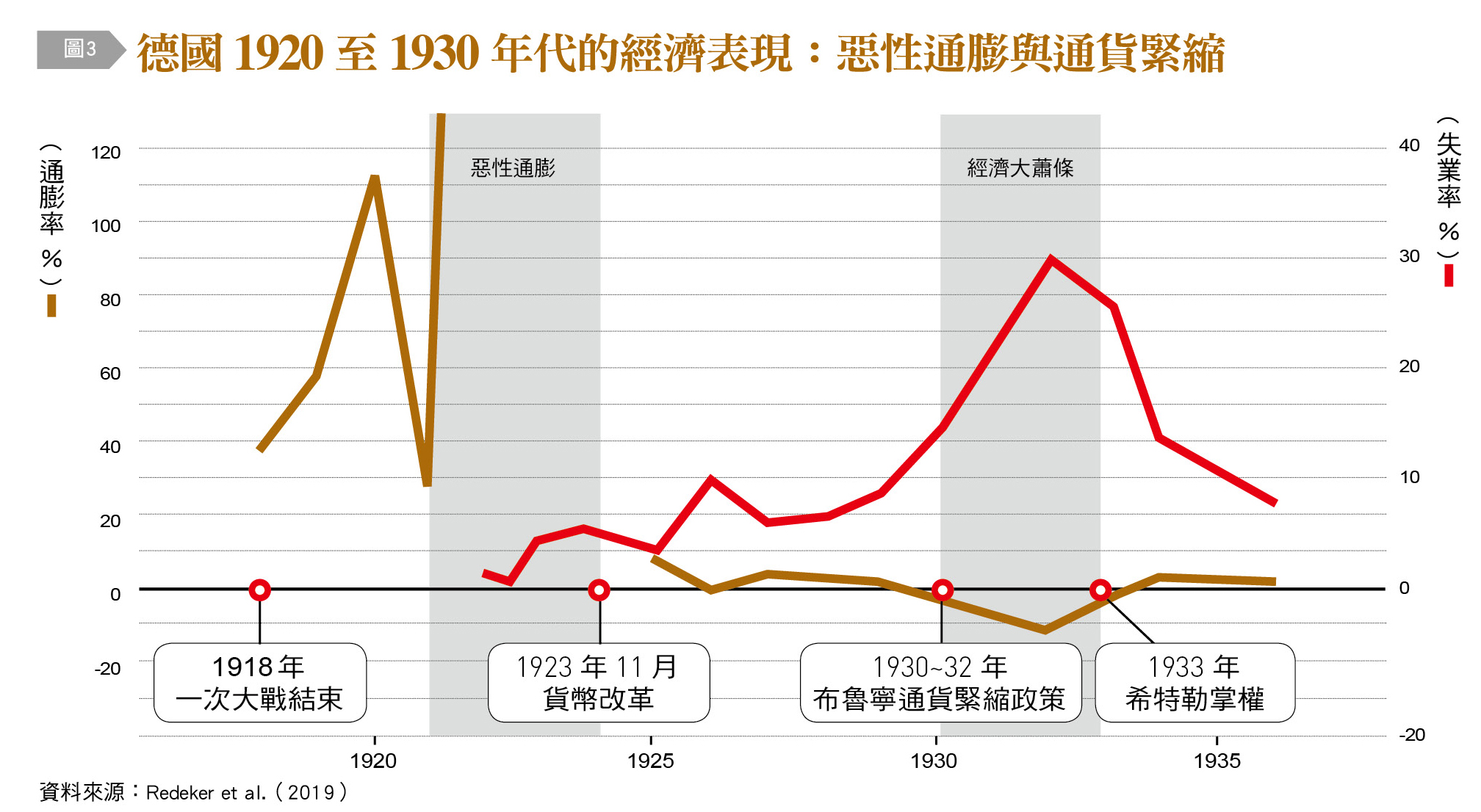 最後附帶一提且仍與歐洲央行政策成敗息息相關者,是本文一開始就提及德國(與部份北歐國家)的反對立場。即使原則上歐洲央行的決策仍是一國一票制,但畢竟以該國政經實力,其國內輿情是不能置之不顧的。然而新冠疫情爆發前夕的一份智庫問卷調查研析,顯示當前社會大眾態度的確深受過去歷史經驗影響,但問題是對於歷史經驗的理解,卻與實際情況有顯著偏差:首先,德國在1920年代面臨的是惡性通膨,1930年代則是極度通貨緊縮〔見圖3〕,但現今德國人對於前者的印象遠較後者深刻,而當前的問題卻與後者類似;其次,1932年德國通膨為負,但超過一半與15%的作答者,分別回答當時通膨超過10%與100%,只有4%的作答者正確說出物價下跌,且幾乎沒有人正確說出通膨為負;第三,教育程度或所得越高,或是自稱對於通膨有所了解者,答錯的比率反而較高,在學學生或是具移民背景者,反倒沒有顯著差異;最後,該報告也將鄰近且制度文化接近的荷蘭納入作為對照,亦呈現類似的歷史認知偏差現象。