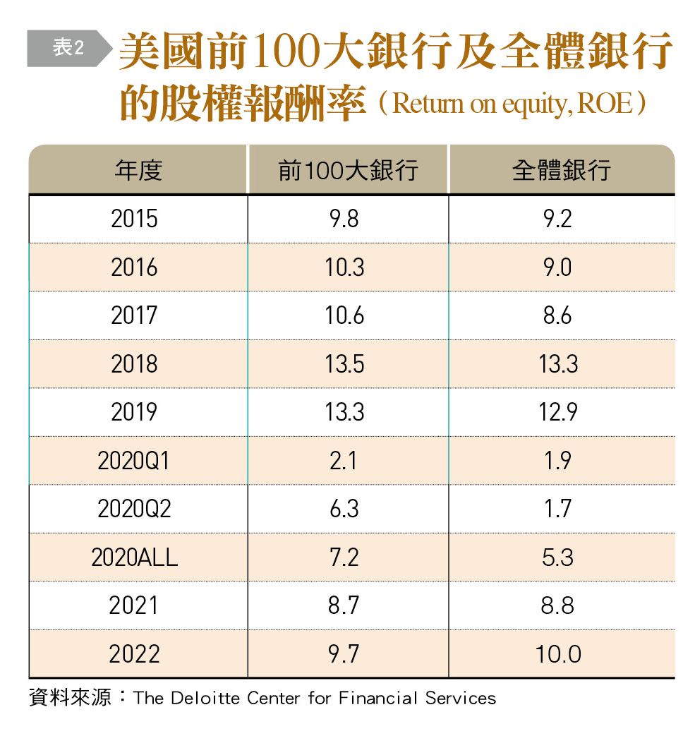 比較美國前100大銀行及全體銀行的股權報酬率(Return On Equity, ROE)〔表2〕,也可產生類似的結論。總體而言,由於大銀行有足夠的資源投資遠端工作相關的基礎建設,較其規模較小之同業,不僅在2020年前獲利較佳,在疫情發生後獲利能力所受衝擊也較小。適當的設計遠端工作流程並安排輔助設施,是有機會可創造銀行及員工雙贏。除了上述的優點外,對銀行而言,遠端工作可降低辦公室成本,減少空間需求。對員工而言,可以增加工作彈性,減少通勤的成本。