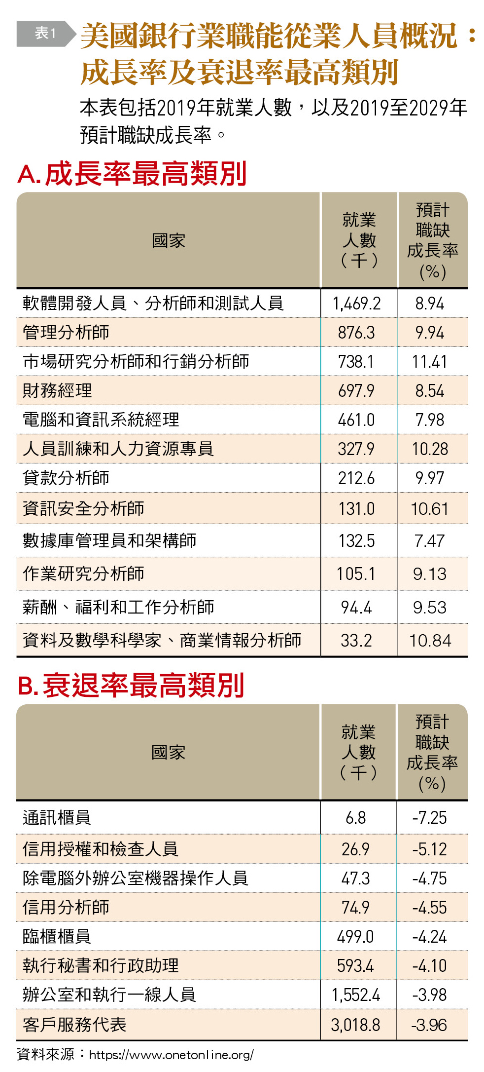 銀行業改變傳統營運模式,增加應變彈性,並不是一朝一夕間突然發生。近十餘年來,因為科技進步,且千禧世代工作與消費模式及態度也已跟之前世代有相當的差別,遠端工作漸為一股潮流。惟2020年瘟疫流行扮演著臨門一腳。〔表1〕詳列美國銀行業成長率最高以及最低職能類別從業人員概況,包括2019年就業人數,以及2019至2029年預計職缺成長率。雖然這些統計數字是在COVID-19肺炎流行前,但均已顯示專業需求成長最快的類別都和遠端工作密切相關,如軟體開發、分析和測試、市場研究和行銷分析、資訊安全分析、資料科學、商業情報分析。由於這些工作類別在不同產業的勞動需求亦同頗殷切,薪資報酬成長也最為迅速。例如在2019年,軟體開發職位平均年薪可達11萬美元以上。另一方面,傳統銀行辦公室內工作需求則面臨下降,特別是臨櫃櫃員、執行秘書和行政助理、第一線執行人員、客戶服務人員。主要原因包括傳統銀行存貸業務利差日益微薄(在大部分的國家都是如此),需減少人力、加強自動化、擴大規模經濟以控制成本,已成為不得不然的趨勢。另一方面,許多傳統銀行業務屬於高重複性、薪水資金成長有限工作,難以吸引新進人員,使用自動化或採用人工智慧,可以比人員更有效率。在2019年,上述工作平均項目年薪都低於3.8萬美元。可以想見未來的數年,在美國,銀行員的定義以及銀行業務處理方式,將與過去一般人的理解大相逕庭。也促成更多的銀行業務改由遠端工作的可行性。對於現有員工而言,訓練學習新的技能,已經成為生存必要的法則。雖然與時俱進有個人成本,但亦可增加員工在勞動市場的價值,可謂塞翁失馬,焉知非福。