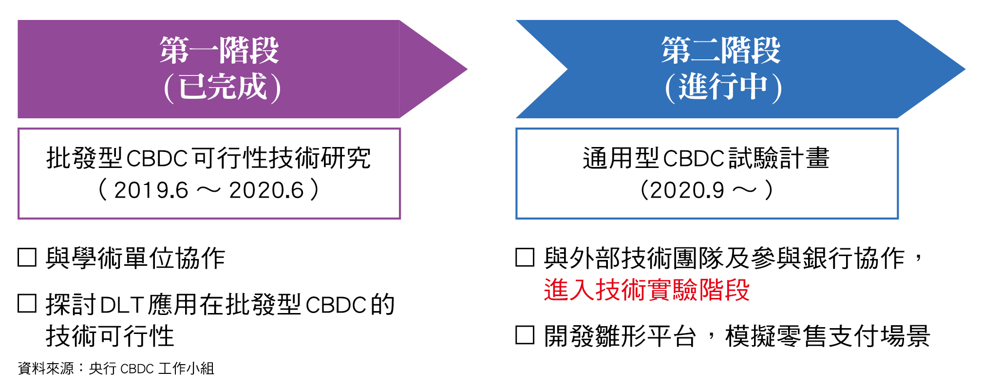 我國央行第一階段「批發型CBDC可行性技術研究」,是從2019年6月到2020年6月,與學術單位協作。研究結果發現,以分散式帳本技術(DLT)建構的批發型CBDC平台,為符合金融交易的隱私保護與追蹤溯源要求所設計的機制,在整體運作效能上並未明顯優於現行中心化系統。