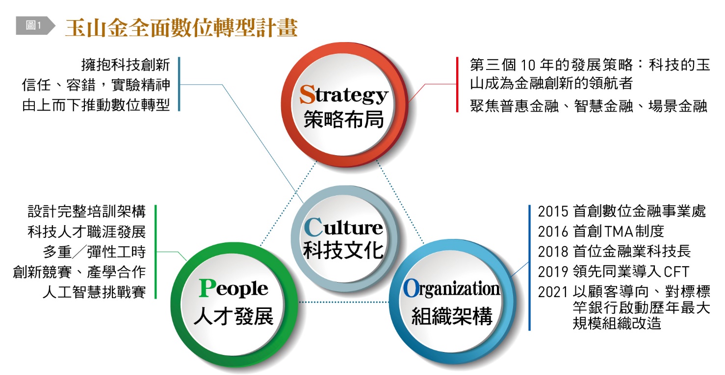 突如其來的一場疫情徹底改變世界面貌,所有人類行為因此受到影響,加上近年氣候異常、種族紛爭、性平等議題抬頭,為了因應大環境各種來勢洶洶的變化,不少金融服務順勢轉型,其中玉山銀行更深耕ESG永續經營發展策略,同時聚焦數位轉型。玉山一開始就清楚,數位轉型並非只是單純的科技導入,而是必須進行一連串的策略、人才、資訊、組織,甚至商業模式的調整改造,才能達到全面數位轉型〔圖1〕。