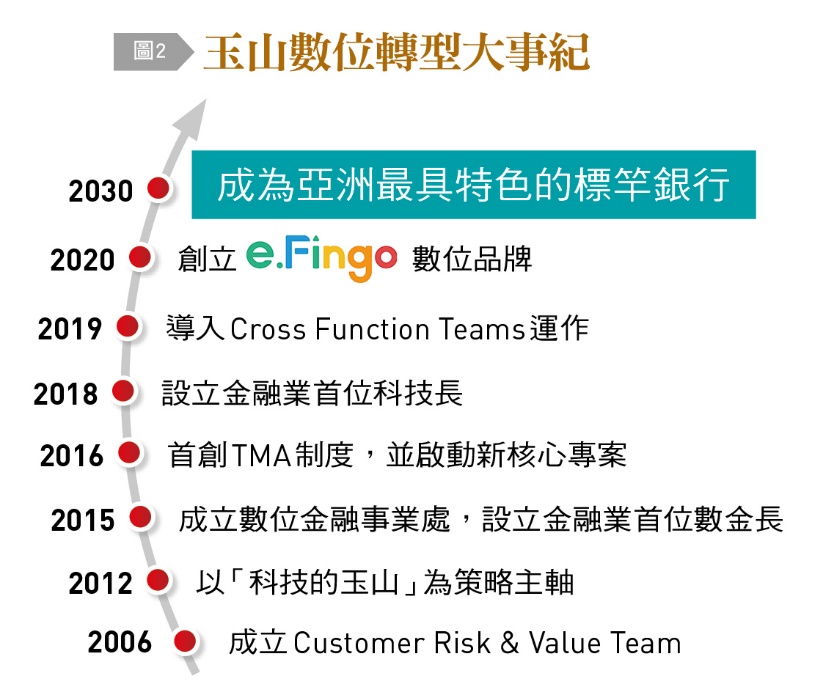 玉山銀行的轉型歷程是自1992年成立以來就已逐步展開,每10年訂定一個長期發展策略;自1992年至2001年為「服務的玉山」,領先將精緻服務與全面創新的概念帶進金融業,首創大廳接待員與顧客服務師,榮獲國內外許多銀行業服務大獎。2002年至2011年是「專業的玉山」,聚焦自我有機成長、策略聯盟及審慎M&A。2012年至2021年則是在行動裝置普及、消費者行為改變與政府法規的開放下,開始積極啟動數位轉型的腳步並定調為「科技的玉山」,積極展開數位轉型,每個階段都扎實穩健、求新求變,期望在2030年成為亞洲最具特色的標竿銀行〔圖2〕。
