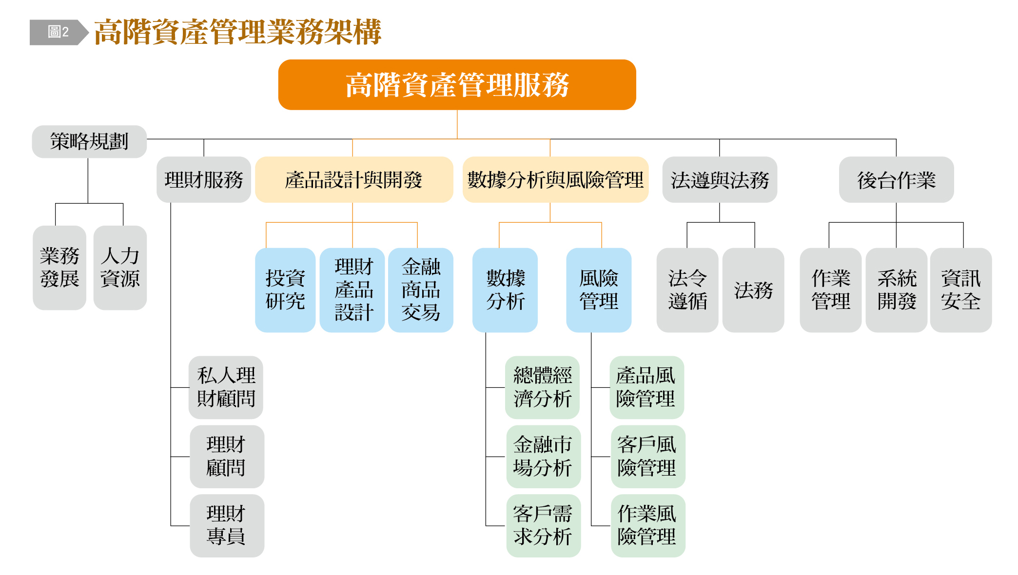 黃崇哲強調,經盤點高階資產管理業務架構後〔圖2〕,確認當前最關鍵的人才缺口在於中台的產品設計與開發、數據分析與風險管理等相關業務;其中,產品設計與開發包含投資研究、理財產品設計、金融商品交易等。因此,業界普遍期待國際金融學院設立後,能培育當前國內金融業所欠缺的資產管理及金融科技人才。