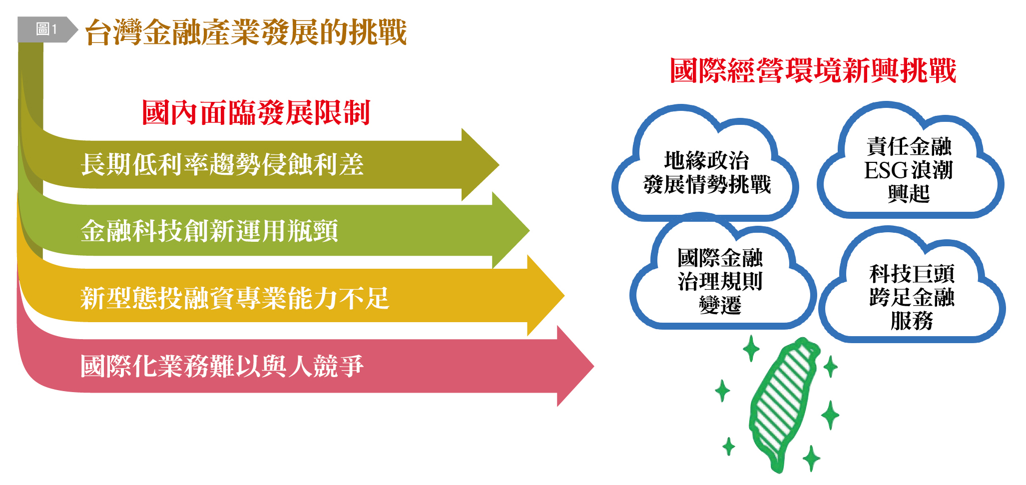 平心而論,金融產業在發展上受到包含長期低利率、金融科技創新運用瓶頸、離岸風電等新型態投融資業務能力有待加強,以及國際化業務難以與其他國際同業競爭等限制。而國際經營環境方面,也持續受到包含地緣政治、國際金融治理規則變遷、責任金融ESG興起以及臉書(Facebook)、亞馬遜(AWS)等科技巨擘跨足金融服務所帶來的挑戰〔圖1〕。
