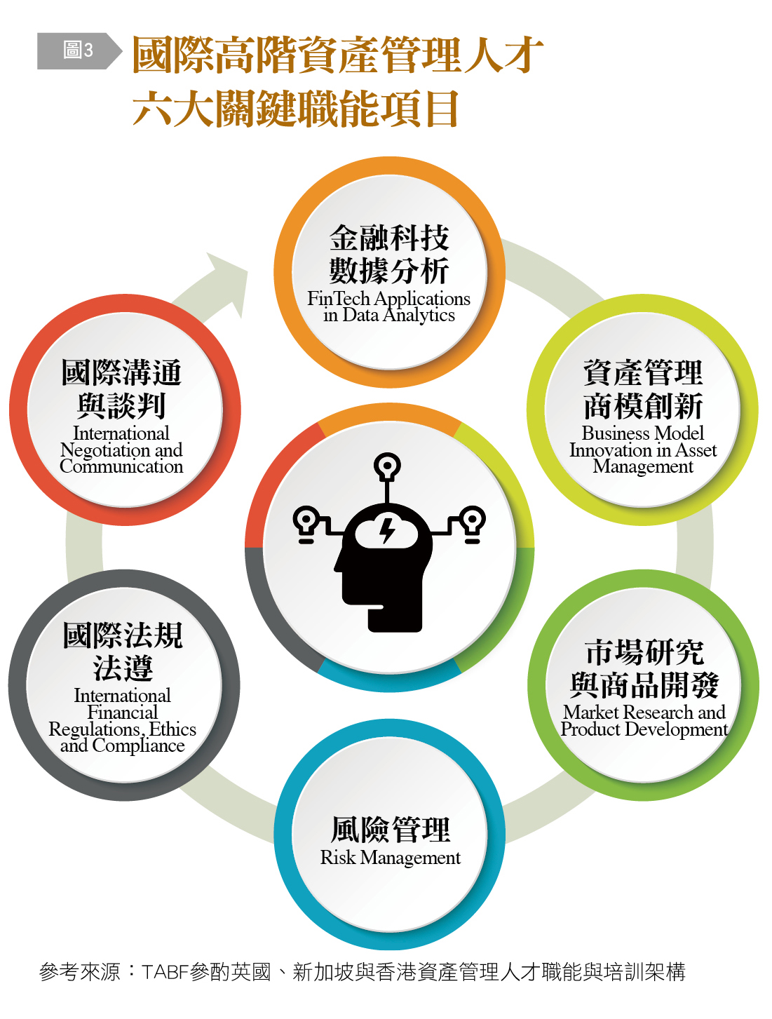「在溝通過程中,我們發現業者特別期待資產管理人才。」黃崇哲表示,金融業分為前台、中台及後台,前台關於臨櫃、銷售,台灣大量金融就業人口集中於此一部分。除銷售前台外,我國金融機構也一向強於後台法遵與管理效率。
