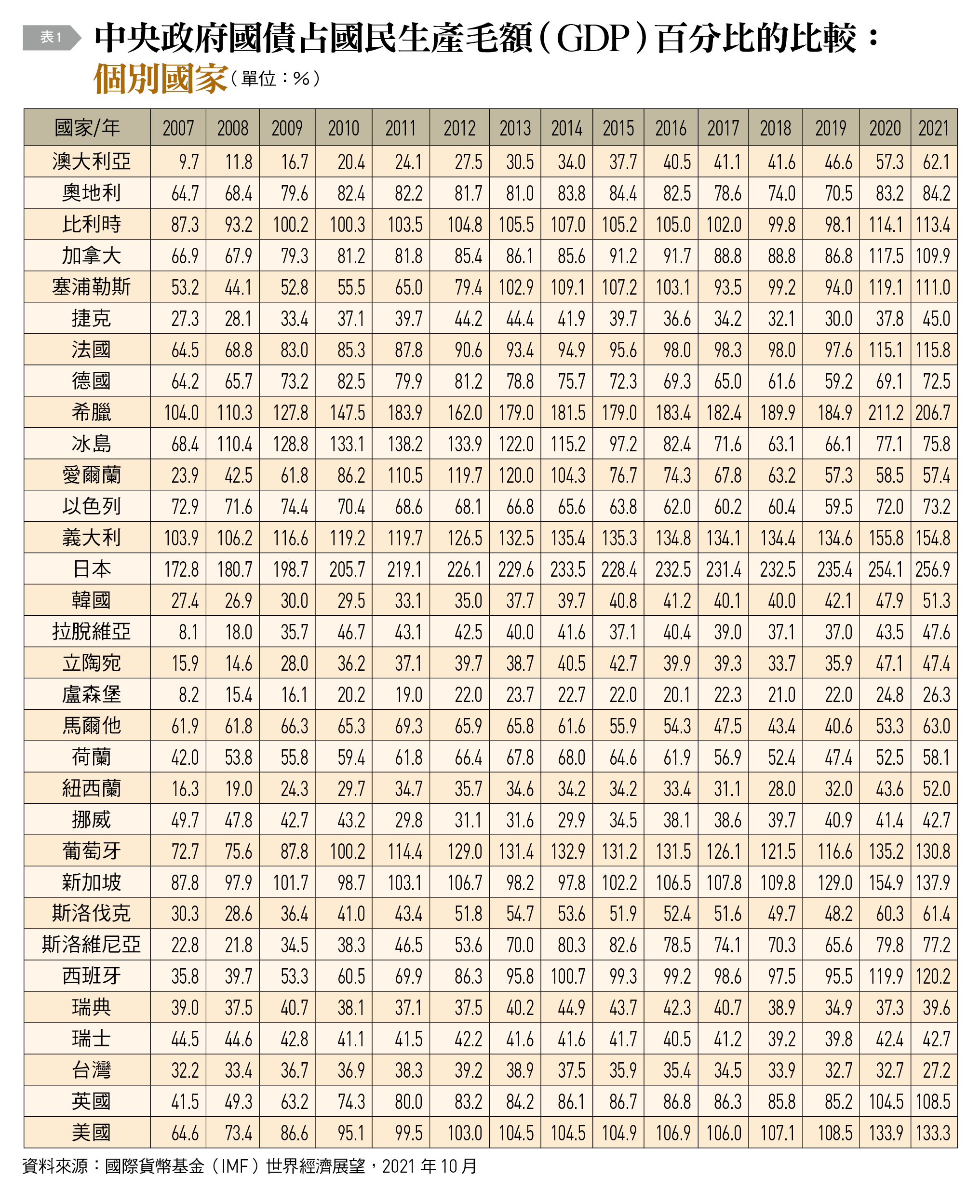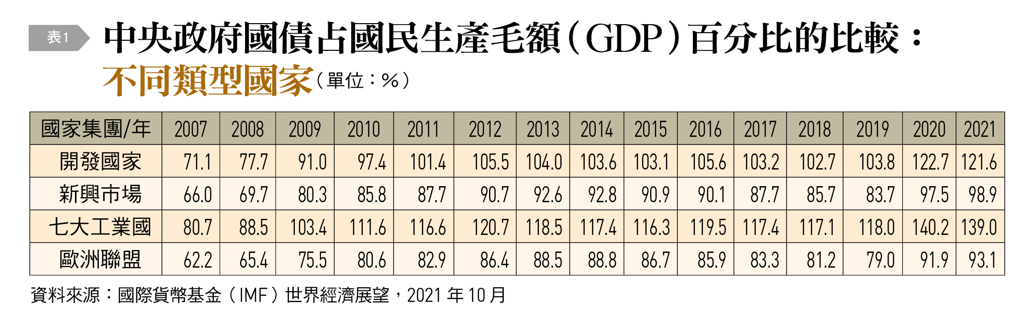以中央政府債務占國民生產毛額(GDP)百分比來衡量政府財務槓桿,〔表1〕顯示,全球政府債臺高築乃冰凍三尺,非一日之寒。根據國際貨幣基金(IMF)估計,2007年至2009年全球金融危機、2010至2015年歐洲金融危機,乃至2020及2021年COVID-19危機所衍生的擴張性財政政策,導致無論是已開發國家或者是開發中國家,政府債務槓桿飆升,僅歐元區和歐盟2010年代後期較之前其債務略微減少。一般而言,已開發國家由於立國時間較久,舉債較為容易,債務槓桿較高。