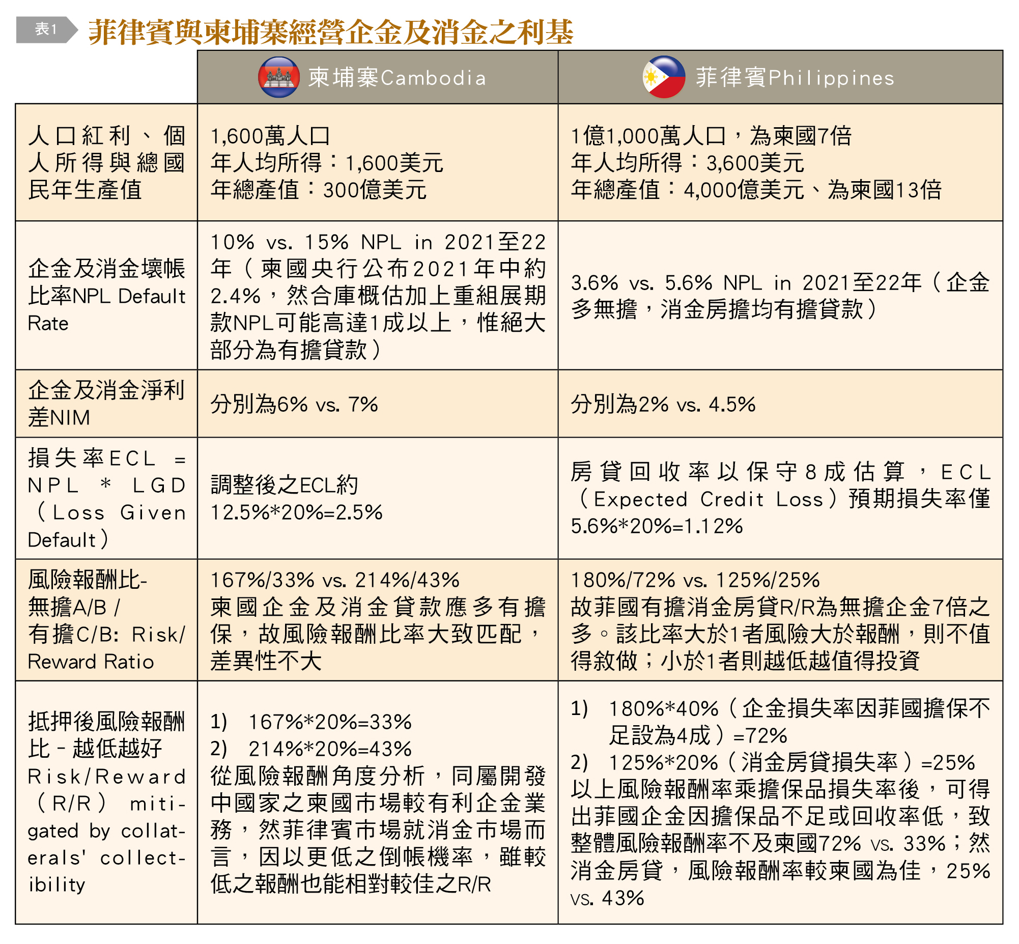 菲律賓人口為柬國7倍、人均所得2倍、國民總產值13倍。菲國縱然淨利差報酬不及柬國,但授信違約率亦較低,以風險報酬角度分析,仍屬可加以開發經營消金房貸之新南向東協市場,從風險報酬角度分析,柬國市場較有利企金業務;然菲律賓市場就消金市場而言,因以更低之倒帳機率,雖較低之報酬也能得出相對較佳之風險報酬率而值得開拓。
