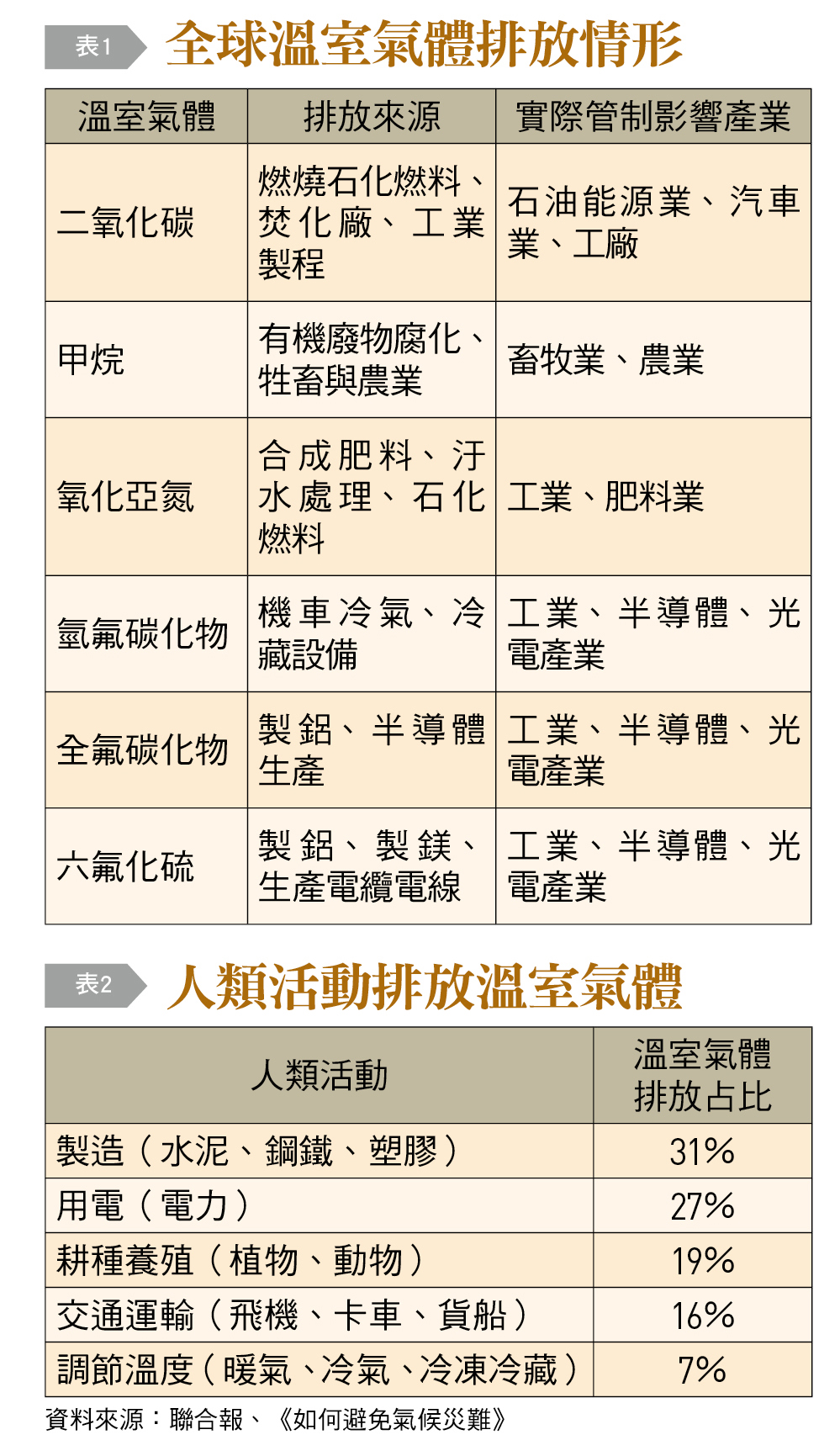 根據統計,全球一年碳排量約510億噸,其中台灣一年碳排量3億噸。近期科學研究已證實人類活動碳排放為全球升溫主因,而且溫室氣體不只是二氧化碳,還有甲烷、氧化亞氮等其他氣體〔見表1、2〕。