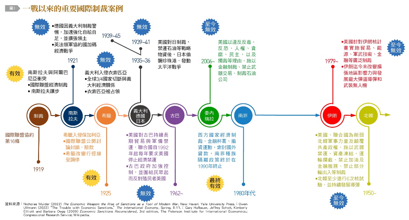 當前美歐等國對俄羅斯施行的經濟制裁,源於一戰後問世的國際制裁,且於二戰後廣被使用至今。經濟制裁不僅改變戰爭與和平的界線及威逼的概念、以新方法繪製與操弄世界經濟地圖與結構,也改變國際法路線。