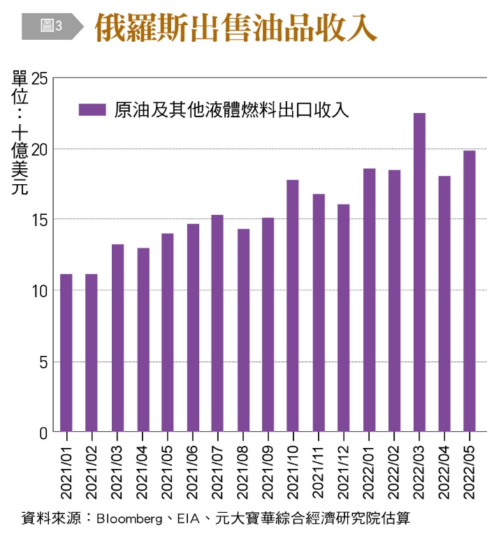 在一連串的制裁下,俄國最終可能回到蘇聯時期自給自足的經濟體系,但俄國總統普丁(V. Putin)至今仍未改對烏「特別軍事行動」的意志。一來是西方制裁剛開始時,盧布暴跌,卻在普丁嚴格控管資本流動下恢復[圖2]。制裁雖使俄國進口被截斷、國內物價上升,官員亦承認將面臨長期經濟問題,惟克林姆林宮確信自己能夠在惡劣的經濟環境下撐個幾年,直到達成預期成果,且俄方因為成功抵禦西方制裁而受鼓舞;二來是烏俄戰爭使能源價格遽升,反讓俄羅斯獲得一筆意外之財。即使歐洲努力戒掉對俄羅斯能源的依賴(今年底前需減少俄國進口原油逾300萬桶/日),莫斯科卻已有辦法改變路線與方式,如以隱匿原產地的方式將石油送到市場、將俄國油品摻在調製後的汽油、柴油及化學品等煉製品中、取經伊朗與委內瑞拉受制裁石油的買賣模式,在海上進行船對船轉運等,將石油運送到中國、印度及其他亞洲國家,甚至西歐,使俄國在開戰後仍因油價上升得以月收近200億美元[圖3]。