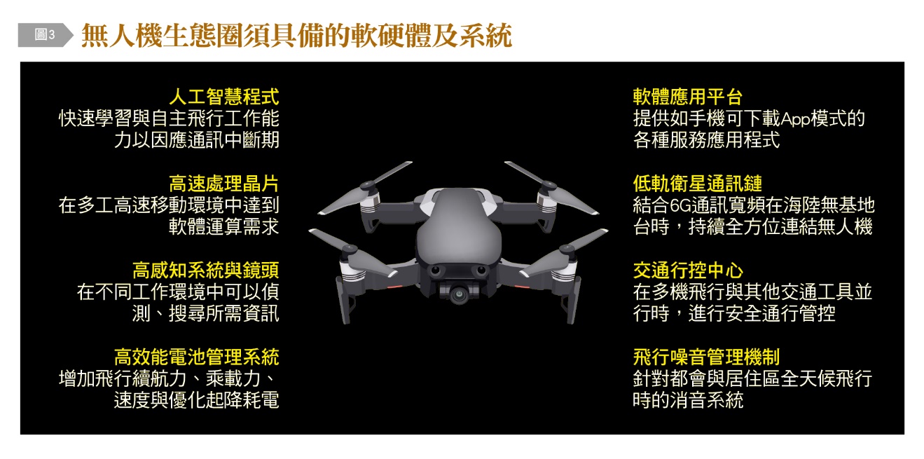 在經濟不景氣、風險尚高的2022年,面對著無人機龐大的全球商機,台灣身為一個高科技島國該如何占有一席之地?筆者認為,除了我們引以為傲的硬體製造技術,企業與政府更須積極整合目前的服務供應商、建構軟體環境與系統平台,方可在高度競爭的國際市場中,提供客戶一個完備的無人機生態圈產品〔圖3〕。