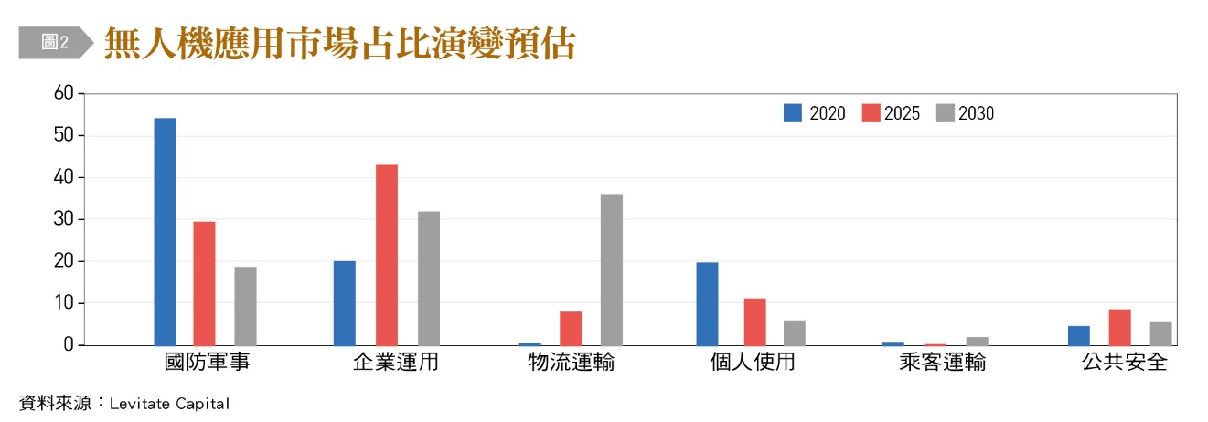 雖然自2020年來,國防軍事為無人機應用的最大市場,但隨著法規開放、傳統軍事研發科技逐漸導入民間企業使用,可以預期私人企業用戶市占率可在2025年超越軍事運用與物流運輸,在2030年成為無人機的主流應用〔圖2〕。無人機可以幫助企業在傳統仰賴大量人力管理和昂貴靜態監視系統的大面積業務,如農業、不動產、運輸管線與油氣礦場等,取得更有彈性效率的服務模式。隨之而來的高頻物流運輸業,除了需要有相關民航法規搭配及民眾接受度,也需要構建更複雜的自動化無人機交通管理系統,以避免無人機在人口密集區發生意外。至於如科幻電影般的無人空中計程車,搭載你我脫離擁擠的路面交通,可能就要看前述應用發展的穩定度與規模,方可走向最終的空中無人大眾交通網絡。