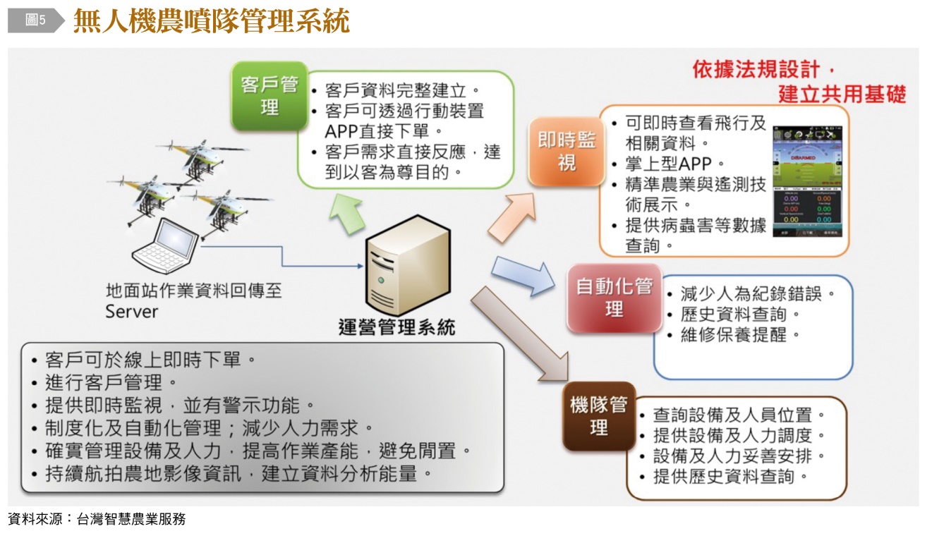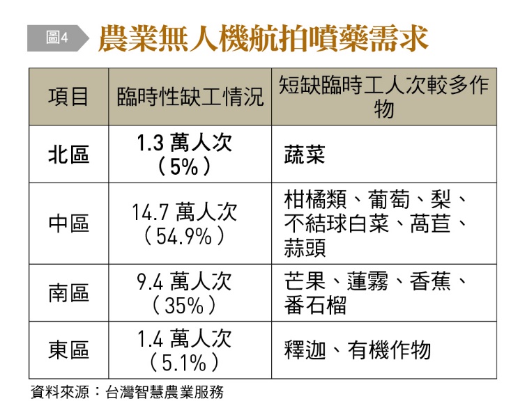另外,面對戰火所引發的糧食危機,台灣更須正視無人機可在國內農業發揮的立即效應。目前全台主力農家27.6萬戶,其中就有2.8萬戶缺工,2020年農業就業人口54.7萬人,預計未來10年約有11萬人離農。而台灣農期短、作物具季節性,無法提供全年常態性工作,引進農業外勞仍難以解決短期缺工問題〔圖4〕。如何建立有效的無人機農業噴藥服務系統〔圖5〕,可視為一提升農經政策利多。