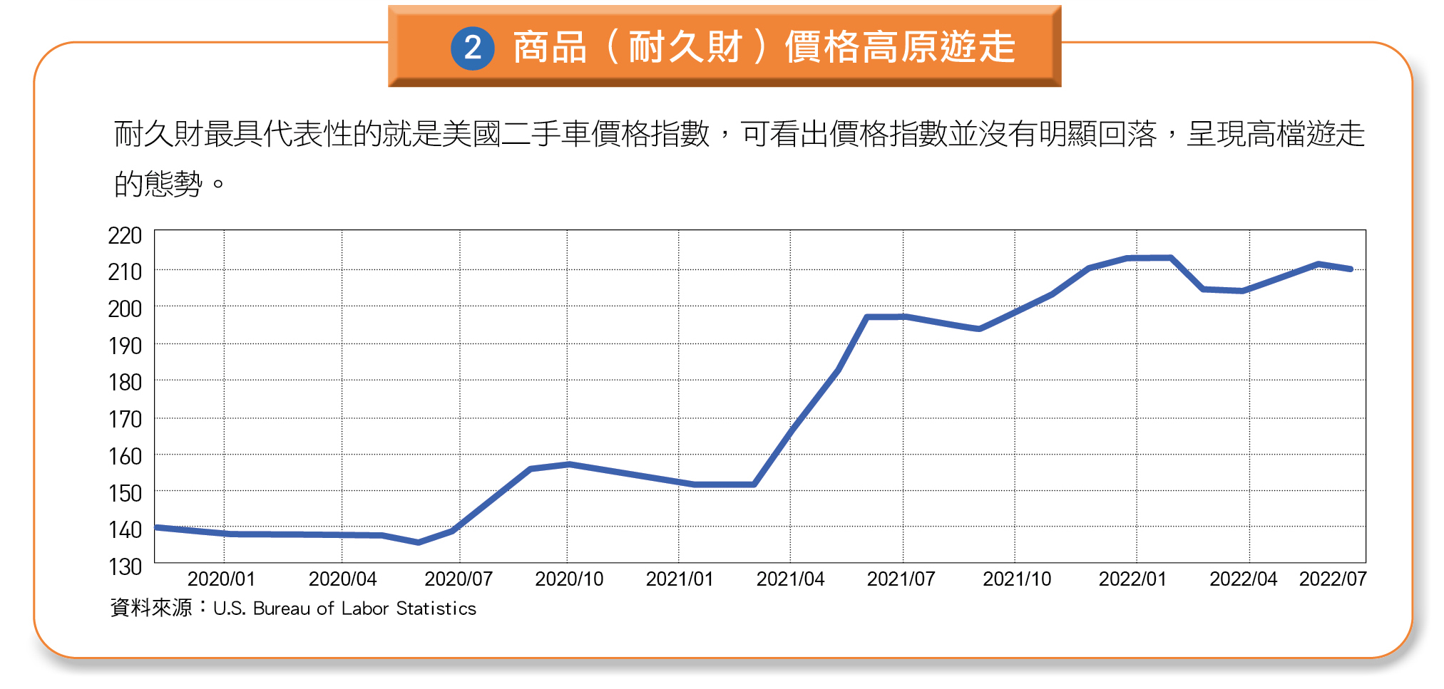 2.商品需求上升,服務需求下降:疫情使消費者的購買情況發生了重大轉變,商品支出急遽上升。因此,起初通膨上升在很大程度上反映在耐久財(包括二手車)的價格。