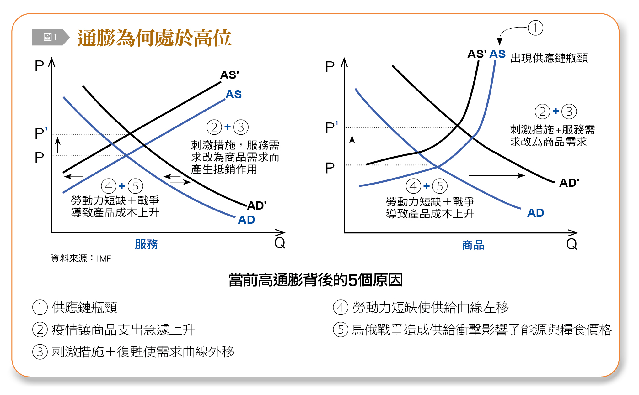 在國際貨幣基金(IMF)近期的報告中,用了一個相對簡單的總供給–總需求曲線(AS-AD)變化圖,清楚說明了造成當前高通膨的五大因素: