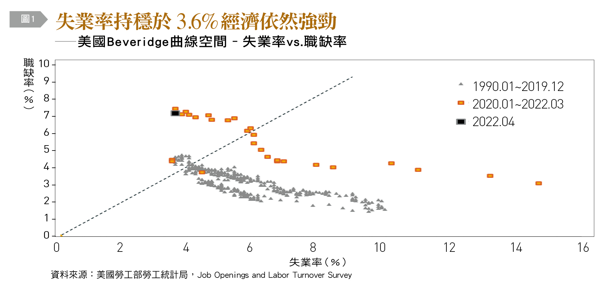 〔圖1〕顯示,美國的職缺率╱失業率(Vacancy and unemployment rates)長期變化情形,可發現自從2020年初疫情發生之後,美國勞動市場發生相當幅度的變化。斜率高低代表勞力市場供需緊俏疲弱的變化,當勞動市場接近供需均衡時,職缺率╱失業率會接近45度線。但近來William Beveridge曲線空間大幅度向左上方高職缺加低失業率方向移動(如橘點所示),失業率穩定在3.6%,近半個世紀以來的最低點,顯示整體經濟仍然相當強勁。根據本文撰寫時可用的最新資料(2022年4月黑正方),已可歸為極端值。即使到6月美國超出預期的新增就業職位37.2萬個,勞動市場需人孔急程度可見一斑。