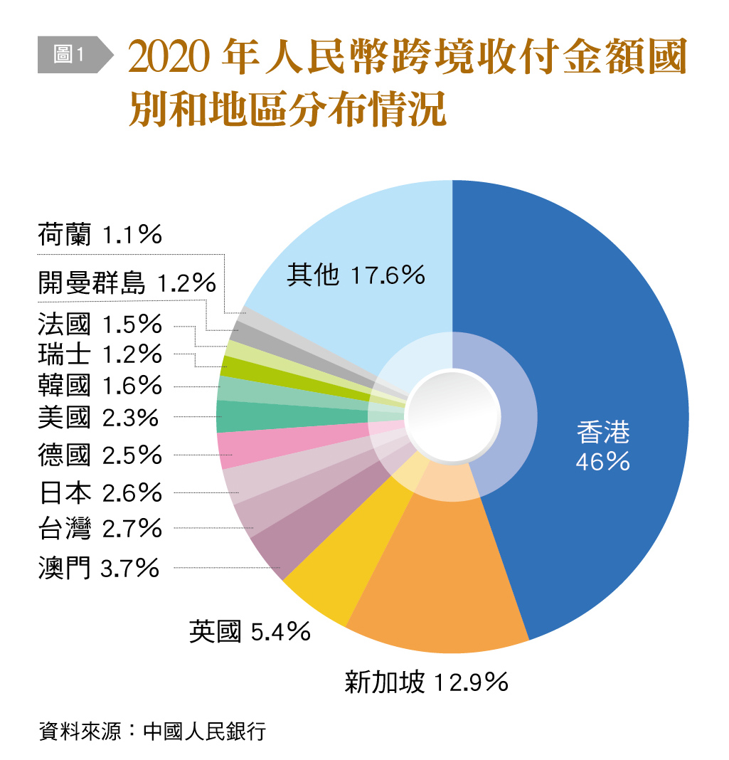 根據中國人民銀行「人民幣國際化報告」指出,近年來,人民幣跨境收付金額快速成長,在2020年已達到28.39兆元人民幣。但若細看其交易對手可發現,有高達46%的交易,是由中國內地與香港之間的交易產生。第2名到第5名的交易對手分別是新加坡、英國、澳門與台灣。值得注意的是,這個排序與中國對外貿易夥伴的排序有重大落差。根據統計,中國最大的貿易夥伴依序為美國、日本、韓國、越南與德國。這應該是中國特別運用一些措施,來衝高人民幣跨境收付金額的量,所造成的奇異現象。當然把與香港的貿易也納入計算,也將使得整個統計數據墊高不少。