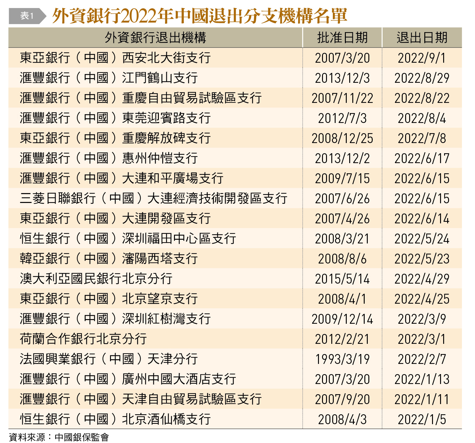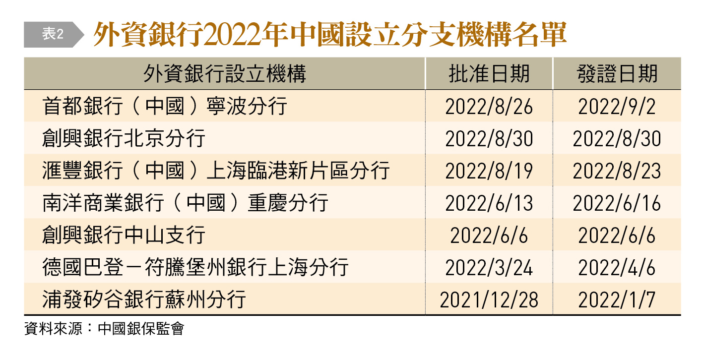 當然,2022年也有新設立的外商銀行機構,總數是7家〔詳表2〕,遠低於申請退出的19家。但這也透露出在當前的局勢裡,仍有外資銀行業者評估成本效益後決定在中國當地發展業務。