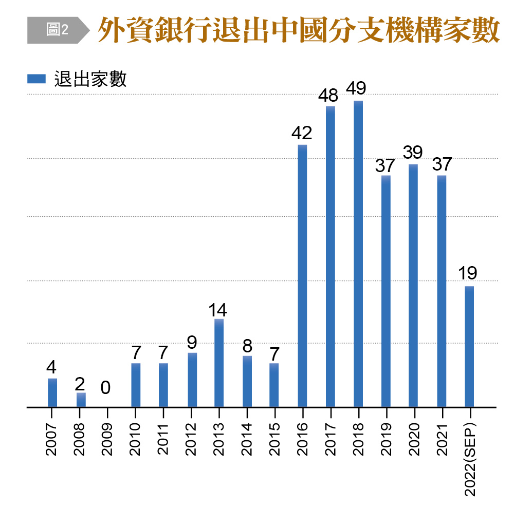 根據中國銀保監會資料,外資商業銀行從有資料的2007年開始至2022年9月初,共有329家機構申請退出,其中從2016年開始,呈現一批高峰〔詳如圖2〕,2022年出至9月初,有19家外商銀行機構退出〔詳表1〕。