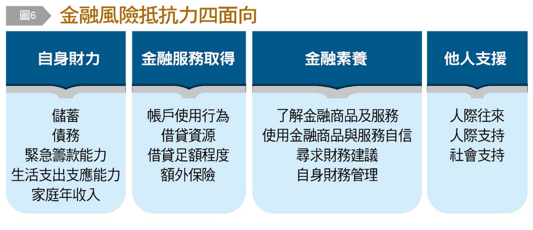 進一步檢視自身財力面向各類型分布情形,發現國人儲蓄M型化現象明顯;整體金融帳戶雖普及,但仍有一些金融服務或功能未被使用,帳戶使用多元性有成長機會;金融素養仍有3成民眾對金融完全陌生,5成缺乏金融自信,國人對金融商品或服務的熟悉度與使用的自信有落差,有自信者約5成,但熟悉金融商品或服務者卻只有近3成,顯示有不少民眾是有過度自信的傾向;他人支援各面向表現皆為中、高,顯見人際往來雖因疫情有點冷卻,但人際支持仍發揮一定的力量。