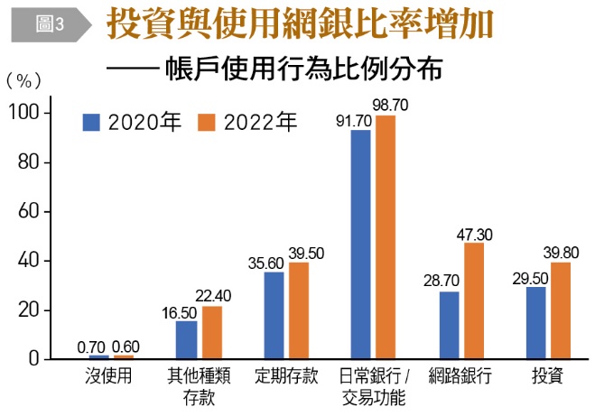 國人擁有金融帳戶的比例與2020年相當,然而這兩年來,使用網路銀行比例大幅增加,從28.7%上升至47.3%,原因在於疫情期間無接觸服務盛行。本次調查也發現民眾的投資行為比例增加明顯,從29.5%提升至39.8%。這兩年來台股指數屢創新高,制度上開放盤中零股交易等措施,且根據證交所網站資料統計,新增台股開戶人數的確也穩健成長中。