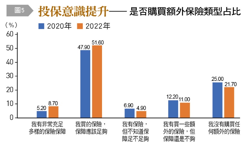 本次調查結果,沒有任何額外保險的民眾從25%降到21.7%,自認購買額外保險保障充足的比例達51.6%。另外,參考保發中心最新統計,2021年壽險各項給付較2020年增加2.4%,其中健康險給付首度突破1,500億元,投資型保單新契約保費也創下新高。