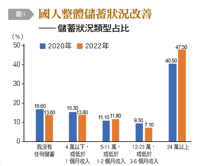 國人整體儲蓄狀況改善,沒有任何儲蓄者比例降低,從16.6%減至13.6%;另一方面,儲蓄非常充足,達24萬元以上者比例增加,從40.5%上升至47.5%。這兩年因疫情影響,民眾的危機意識增加,另一方面,也因為外出休閒旅遊等機會減少,相關開銷縮減,儲蓄相對增加。對照主計總處2021全年民間消費資料統計,消費年減0.45%,顯示民眾將部分消費移轉到儲蓄,台灣的儲蓄率統計也顯示2021年儲蓄率破42%,創下歷史新高。