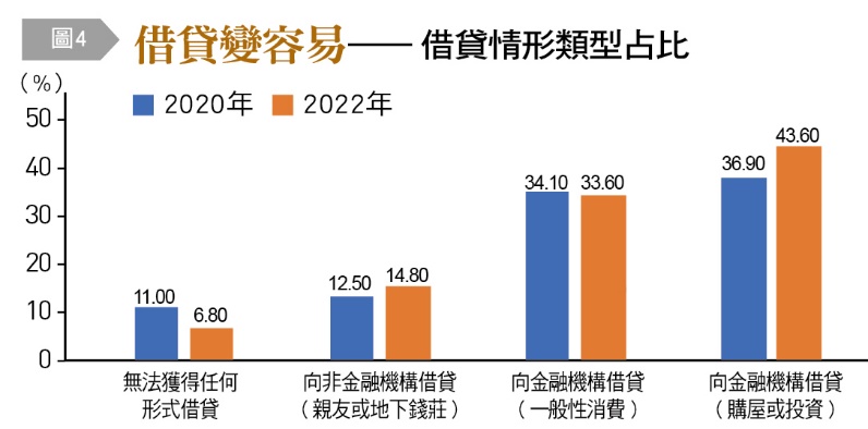 民眾借貸能力這兩年來有所提升,調查結果顯示:即使有需求但也無法透過任何管道借貸的比例減少4.2%,從11%降至6.8%;有43.6%民眾能夠從金融機構獲得購屋或投資方面的借貸,相較2020年36.9%增加將近7%。