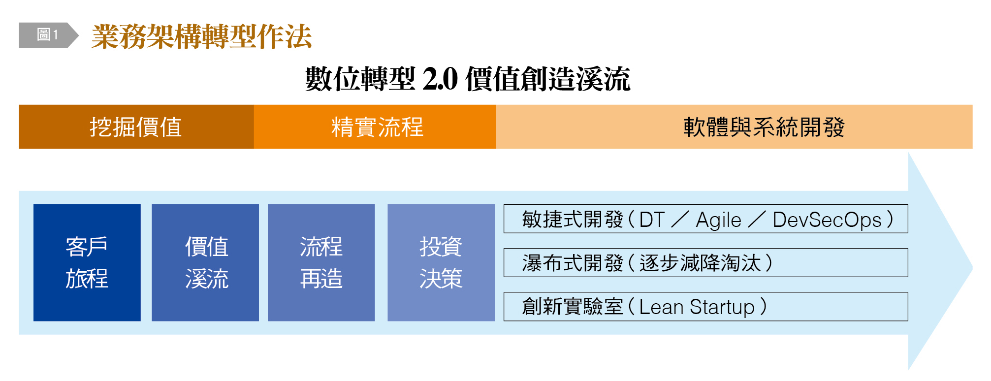 對劉培文來說,找對的事情是問題關鍵,然後才是把事情做對。因此,他深信持續創造供需才能驅動變革,著手制定一系列改造計畫,不僅僅將數位轉型2.0價值創造溪流深植在文化中,更實踐挖掘價值的重要性,一步一步從精實流程再到軟體與系統開發[圖1]。