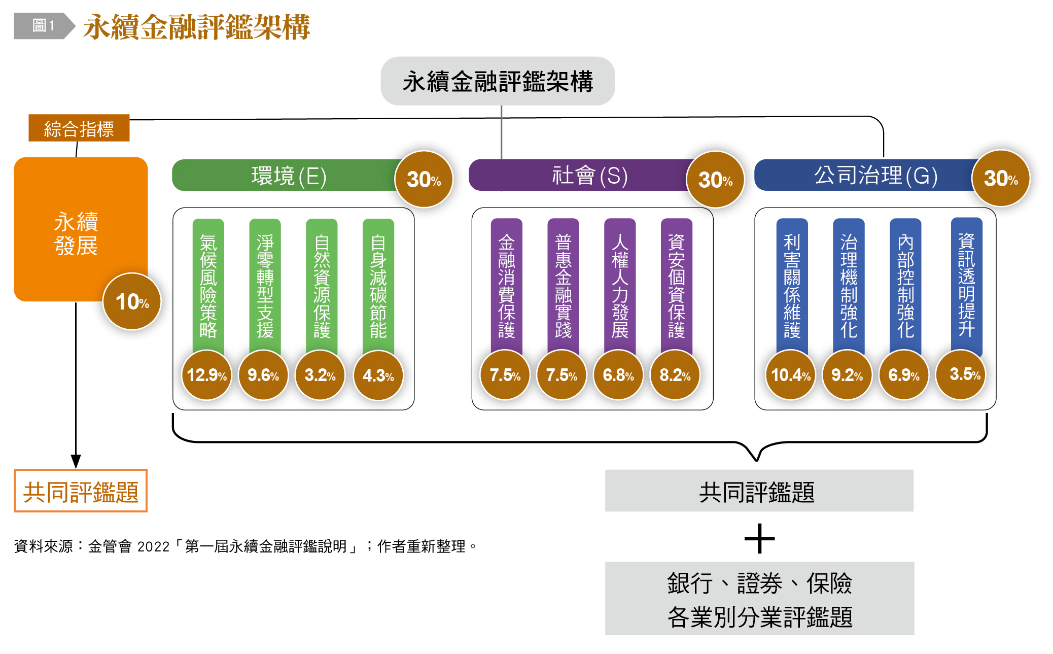 而金管會於2022年底公布的「永續金融評鑑」,就是健全永續金融生態系不可或缺之一環,利用評鑑制度評估各家金融機構的ESG推動績效,鼓勵表現優良業者以發揮標竿功能,進而加速國內永續金融生態圈之建構。此外,更希望永續金融評鑑能引領我國金融業逐步落實永續目標,在ESG各個領域穩步向前邁進。事實上,從金管會所揭櫫之評鑑目的,即不難看出主管機關之期許,希冀國內金融業者能藉此更重視永續發展,使之在擬定永續經營策略及採取行動方案時,能跟我國現行永續政策重點及監理方向亦步亦趨。