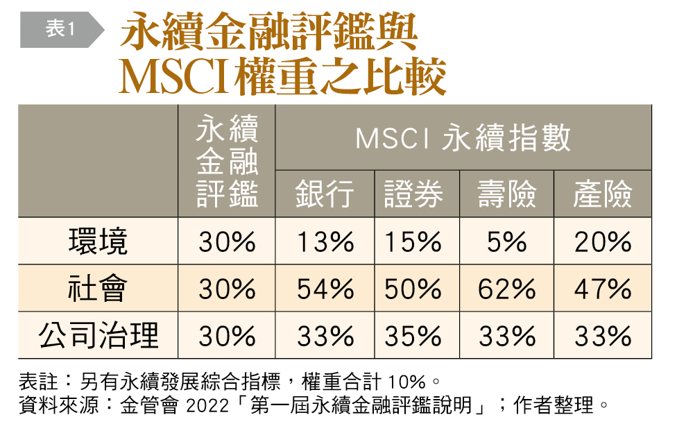 然而誠如前述,一般坊間的ESG評比,其目的為評量受評企業對ESG的投入與績效,惟各企業所屬產業注重的永續議題不盡相同,比如對石化業而言,碳排放是重要課題,但金融業可能更關切資安與個資。對此,為了反映產業間的差異,就需要給予各項關鍵議題或指標不同權重,進而對應在ESG不同的支柱權重上。以〔表1〕MSCI永續指數中與金融業相關之權重為例,可發現除公司治理仍維持至少三分之一以外,鑑於銀行、證券、保險業務性質各異,環境、社會支柱的權重比率落差其實不小。例如產險的環境權重最高可到20%,證券則為15%、銀行13%,但壽險卻只有5%的比重。