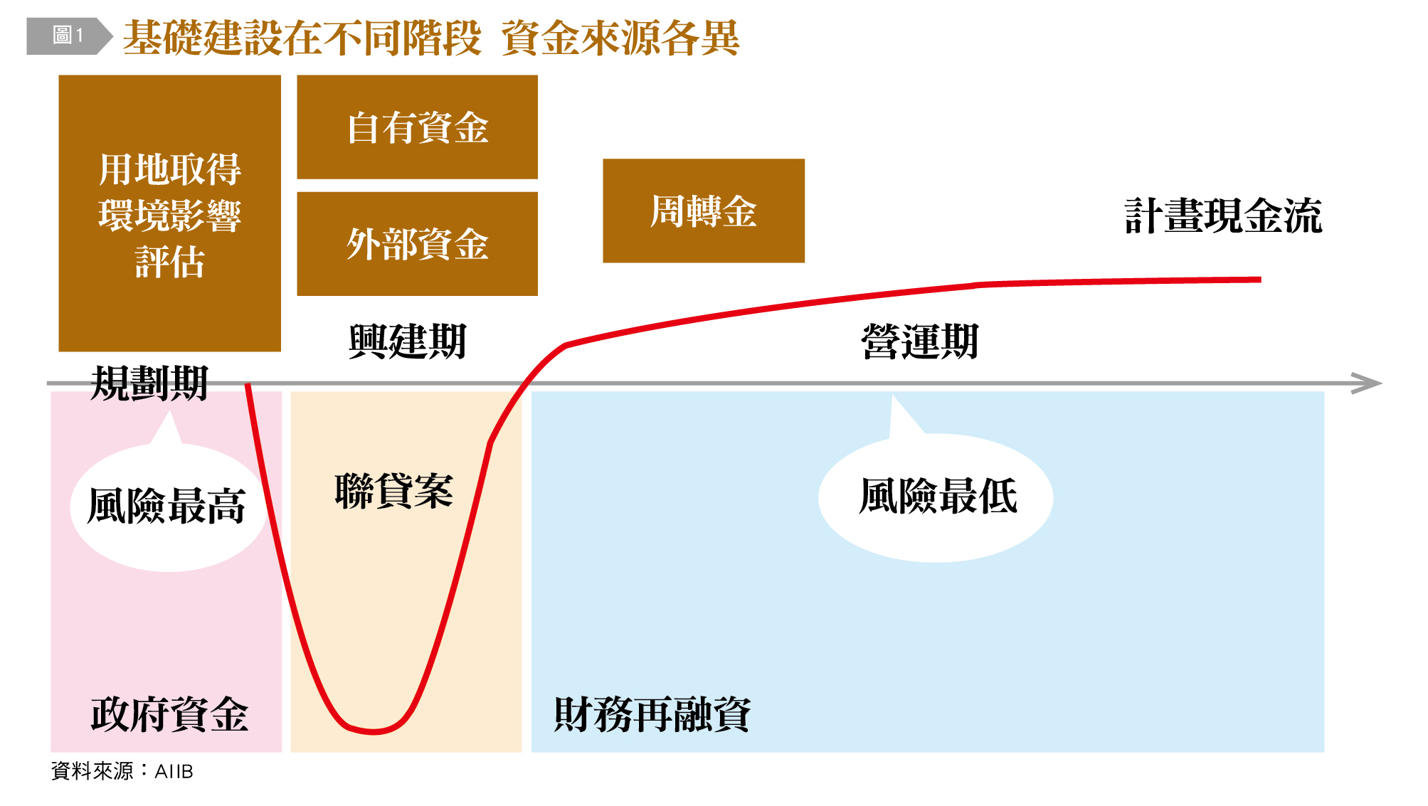 如何引導更多資金縮小能源轉型的資金缺口?亞洲基礎建設投資銀行(AIIB)解釋,基礎建設在不同階段的資金來源〔圖1]。首先,基礎建設規劃期及興建期,因為沒有穩定的現金流,風險較高,資金來源為自有資金及願意承擔高風險的外部資金;接下來進入營運期,因為有穩定的現金流,風險最低,資金來源為周轉金。在能源基礎建設生命週期上,每個階段風險不一,各種資金對風險的接受度也不一樣。進入營運期後,可由機構投資人接手。