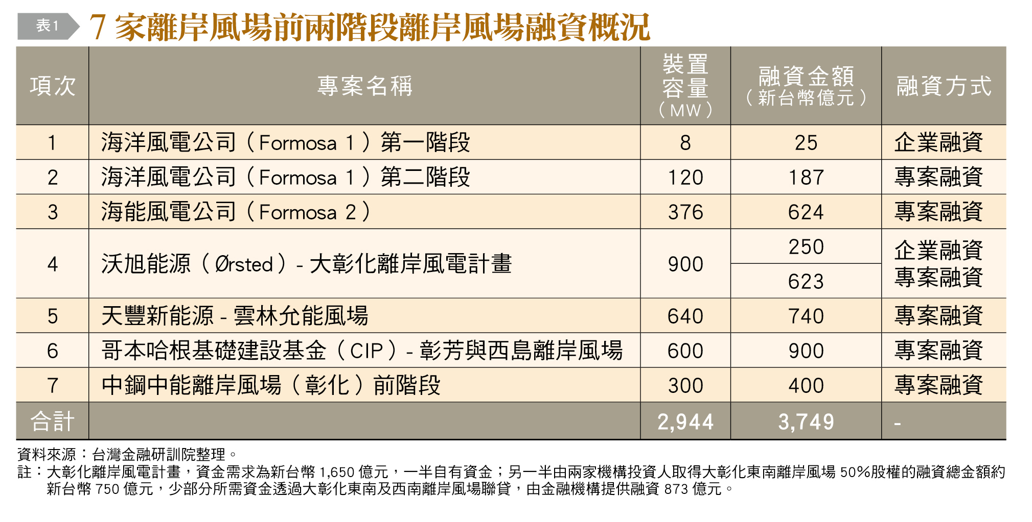 目前我國前兩階段7家離岸風場〔表1],已初步完成約新台幣4,926億元的籌資(包含開發商股權投資的自籌款),除了股權投資之外,主要資金來源為「專案融資」及「企業融資」兩項,目前銀行團對離岸風電的融資金額已逼近新台幣4,000億元,但尚未包含正在進行中的海龍風電聯貸案。海龍風場裝置容量1,044MW,融資金額預估為新台幣1,500億元。
